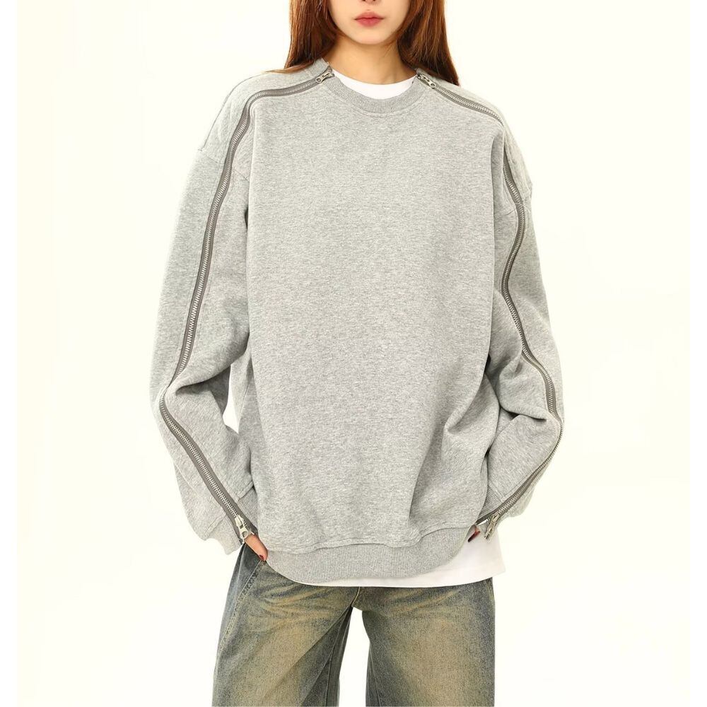 レディース 春秋用 レトロストリート風 ラウンドネック長袖 無地スウェットシャツ ジッパー & ステッチデザイン ゆったりプルオーバー カジュアルパーカートップス