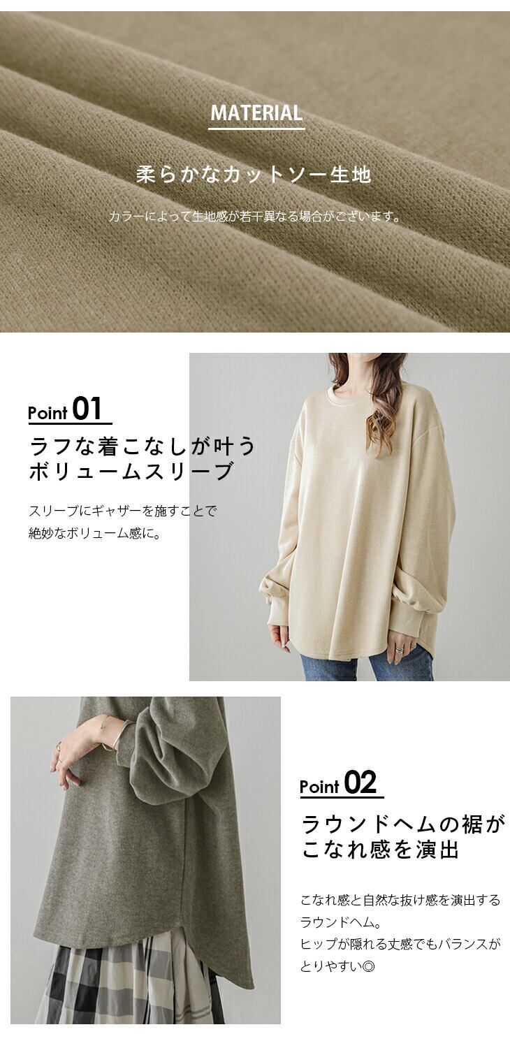 トップス カットソー 長袖 レディース ロンティー ロングtシャツ プルオーバー 体型カバー 全6色 クルーネック ドルマン ギャザー ボリューム袖 ラウンドヘム 無地 デイリー使い 大人カジュアル ゆったり ルームウエア お尻が隠れ 25秋冬 フリーサイズ