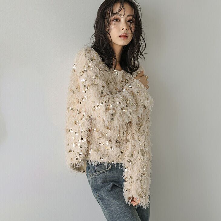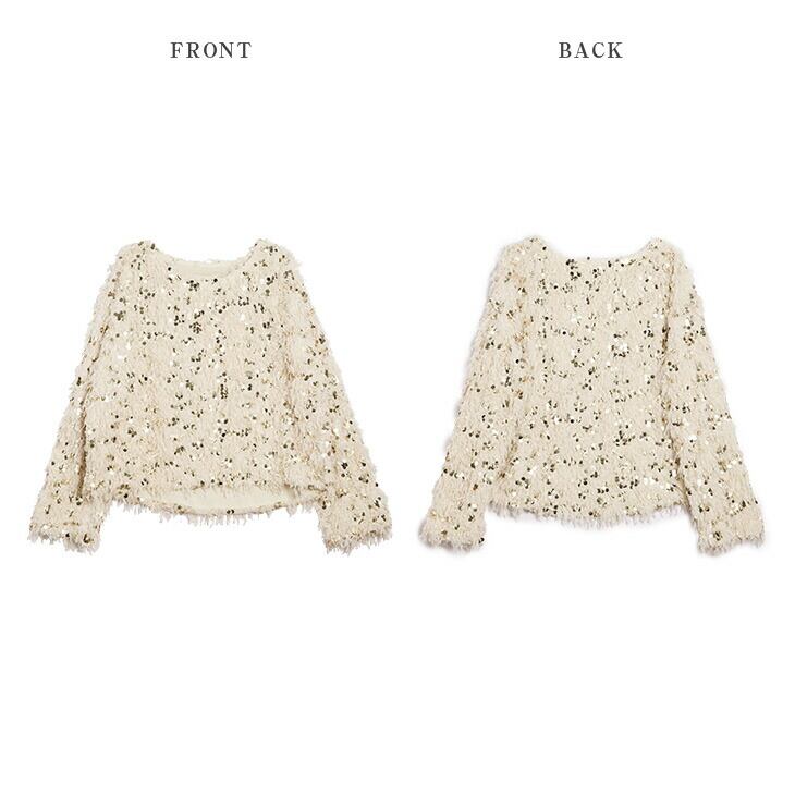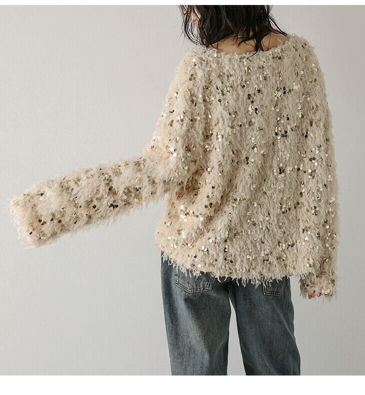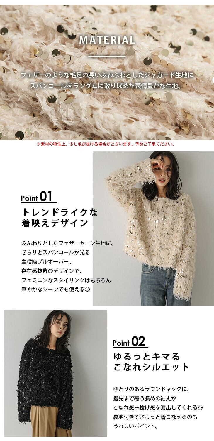 フェザーヤーン スパンコール プルオーバー トップス ラウンドネック ジャガード レディース 大人かわいい トレンド おしゃれ フリーサイズ 2025秋冬新作