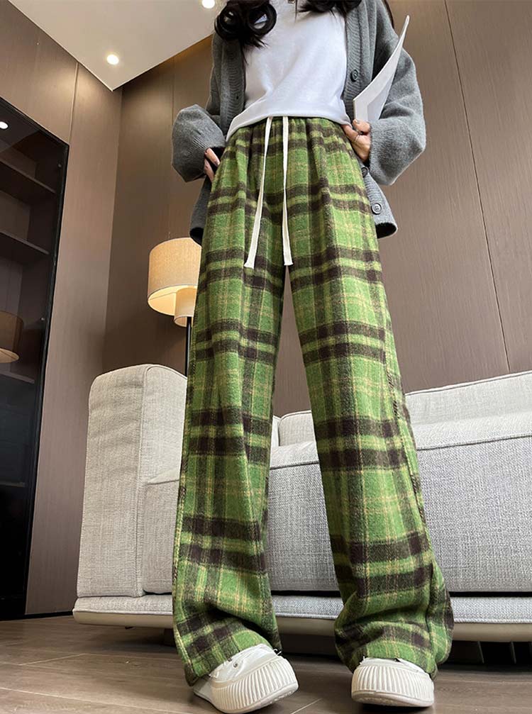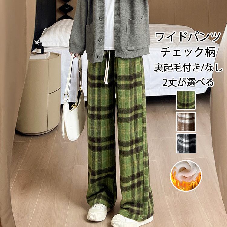 ワイドパンツ チェック柄 レディース 秋冬 ストレートパンツ 裏起毛 ワイド パンツ ウール調 ロング ウェストゴム リボン ハイウエスト チェックパンツ ポケット付き 高身長 低身長 ロングパンツ 暖かい 防寒 イージーパンツ 体型カバー ボトムス 通勤 オフィス 下着 大人