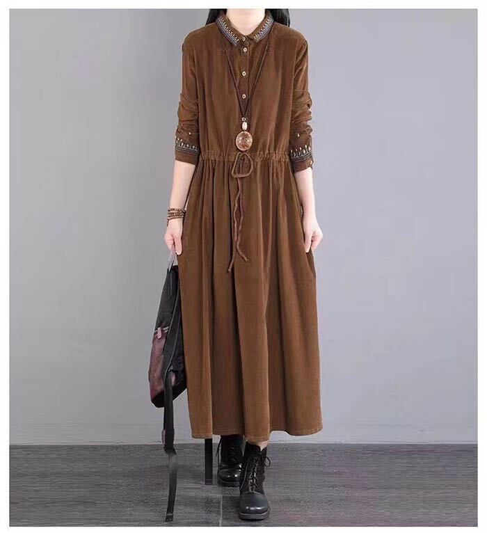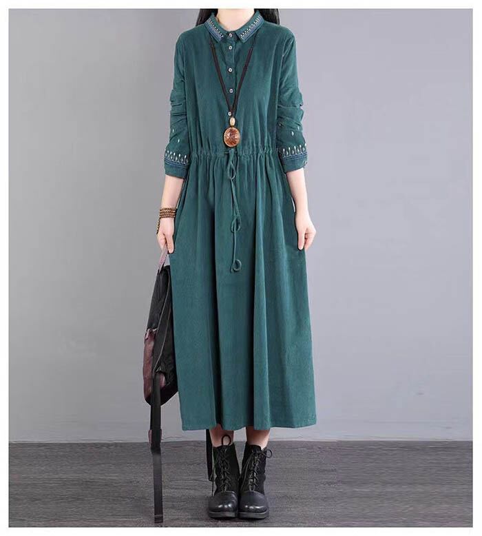 ロングワンピース 長袖 レディース ワンピース ロング丈ワンピ 無地 シャツワンピース Aライン 秋服 フレアワンピース カジュアル ナチュラル シンプル 着痩せ 体型カバー 大人 かわいい 春 秋 冬 紺色 グリーン 春秋