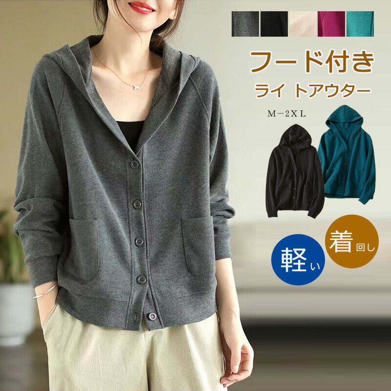 パーカー カーディガン レディース フード付き ニット アウター ライトアウター 無地 長袖 トップス vネック コート ショート丈 スプリングコート ゆったり 秋 春物 羽織り コーディガン ポケット付き 織物 綿 上着 ショートコート ジャケット