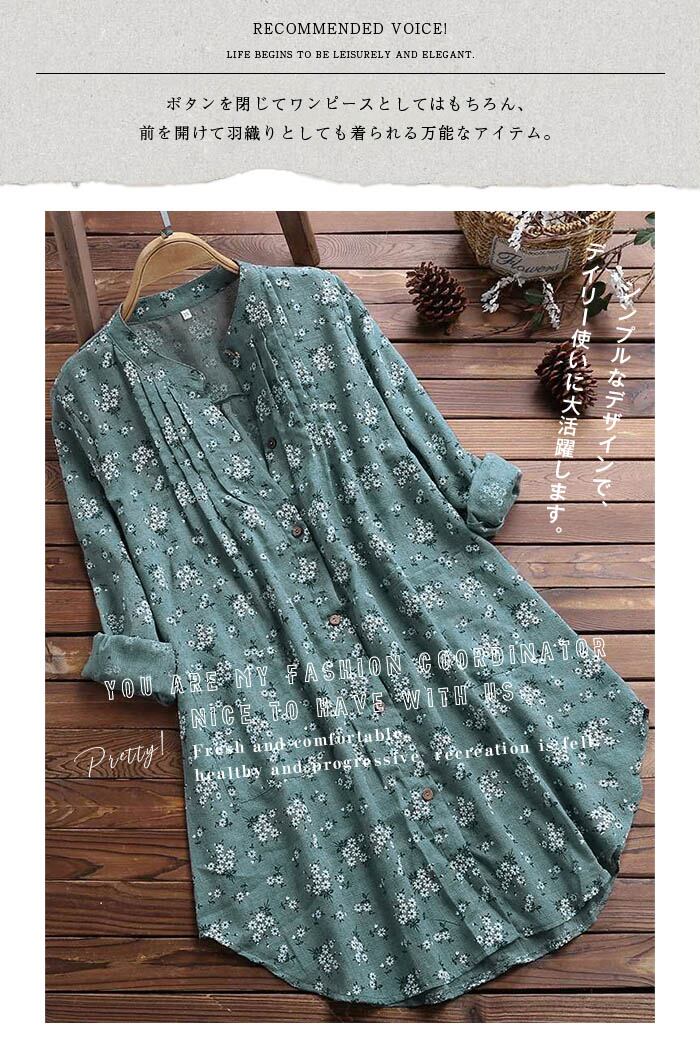 シャツ チュニック レディース ロングシャツ ブラウス レディース シャツワンピ 綿 花柄 トップス シャツワンピース 長袖 ナチュラル 着痩せ ゆったり 体型カバー カジュアル 総柄 春 夏 秋 30代 40代 50代