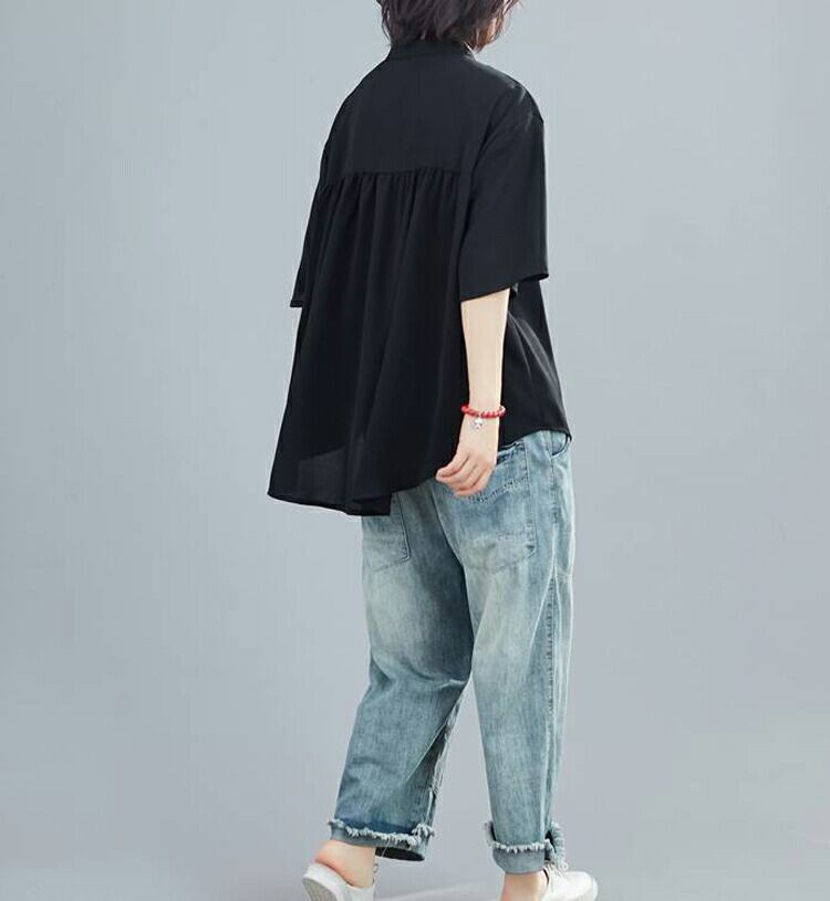 バンドカラー シャツ レディース 半袖シャツ 黒 ブラウス 五分袖 バンドカラーシャツ 涼しい 水玉 スタンドカラーシャツ 5分袖 ゆったり 黒シャツ ギャザー 襟付きシャツ 夏ブラウス ゆるシャツ 前後差