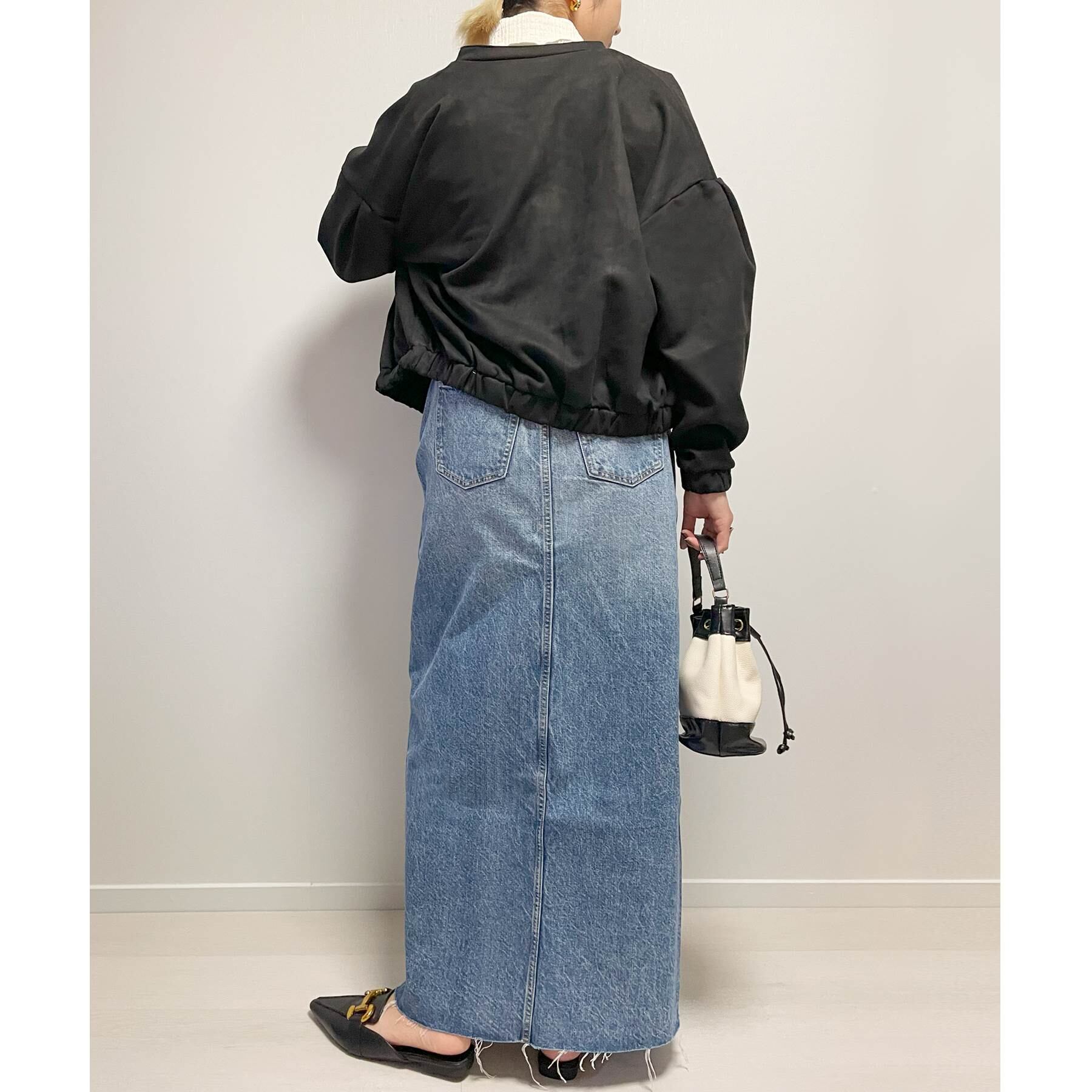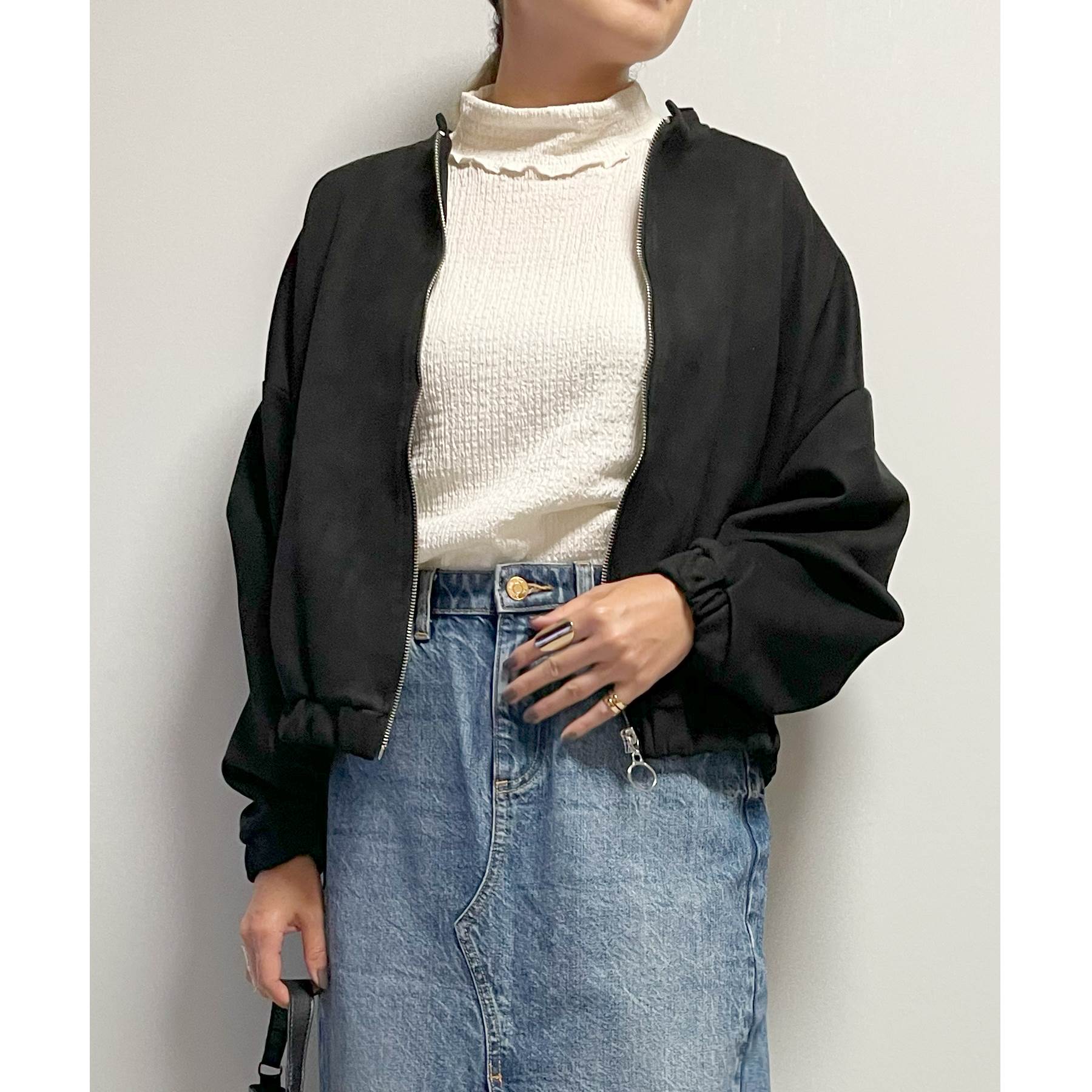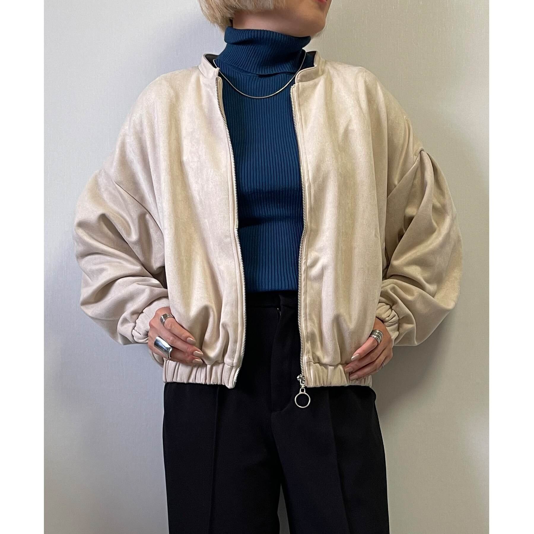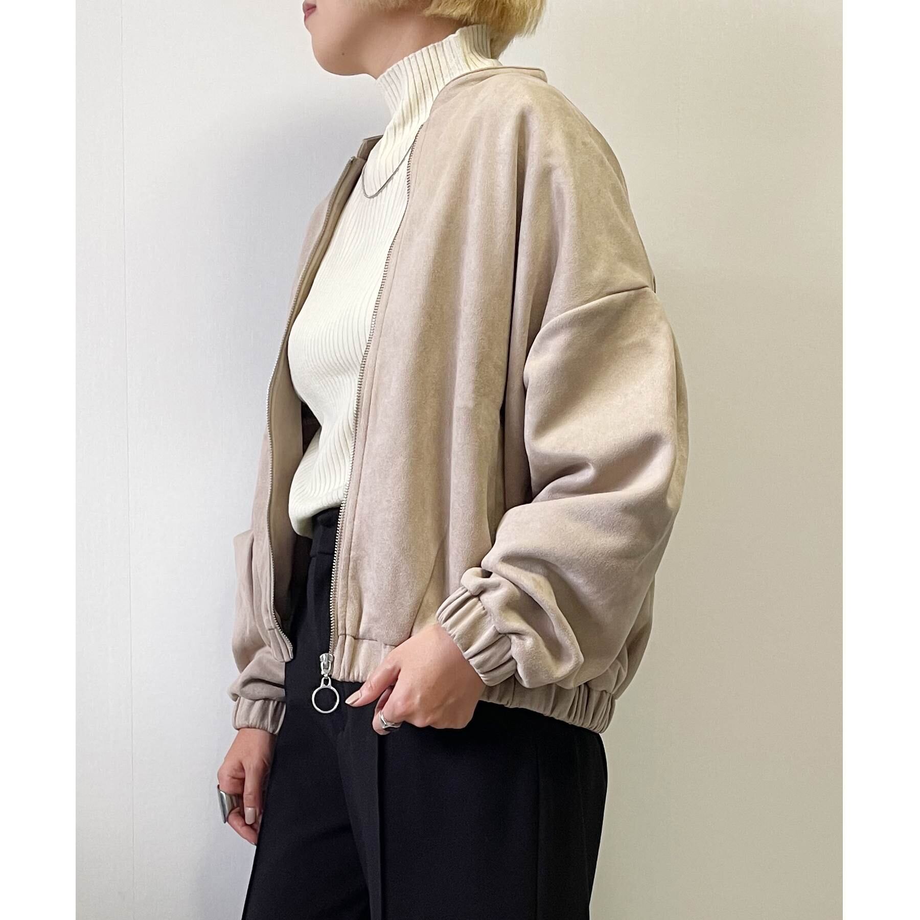 さっと羽織れて便利なフロントジップブルゾンは、スエードの風合いがカジュアルすぎず女性らしい雰囲気に。