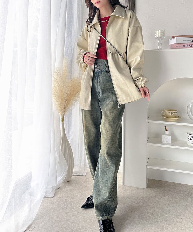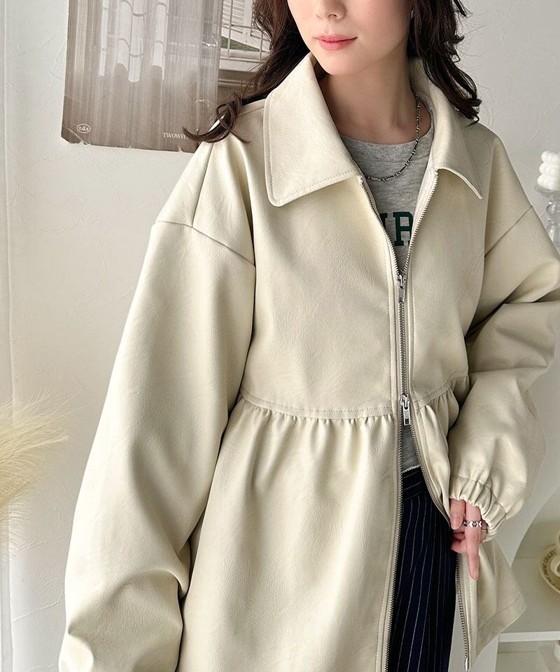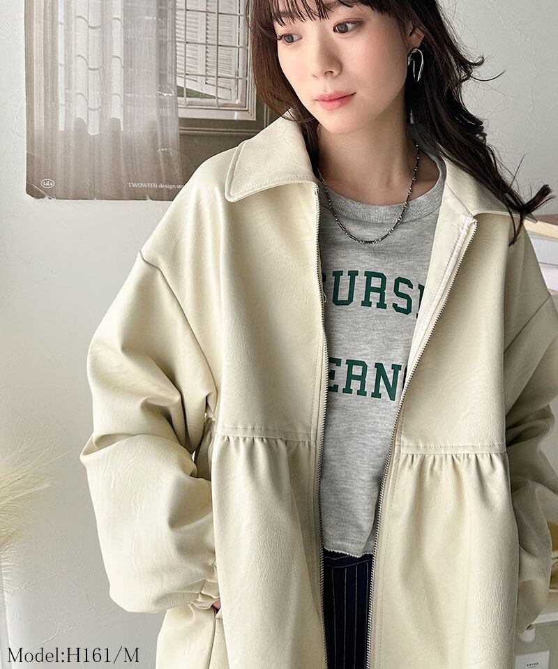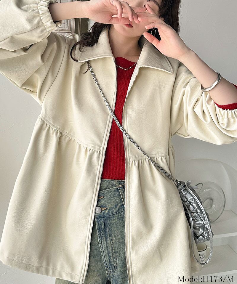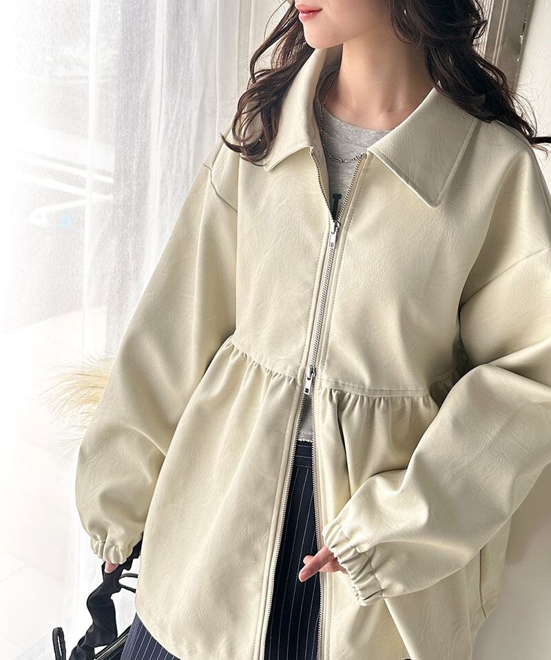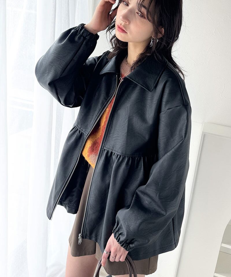 アウター ジャケット レディース フェミニン ペプラム フェイク レザー ブルゾン ゆるっと 体型カバー 高見え ポケット 付き 大きいサイズ 秋 冬