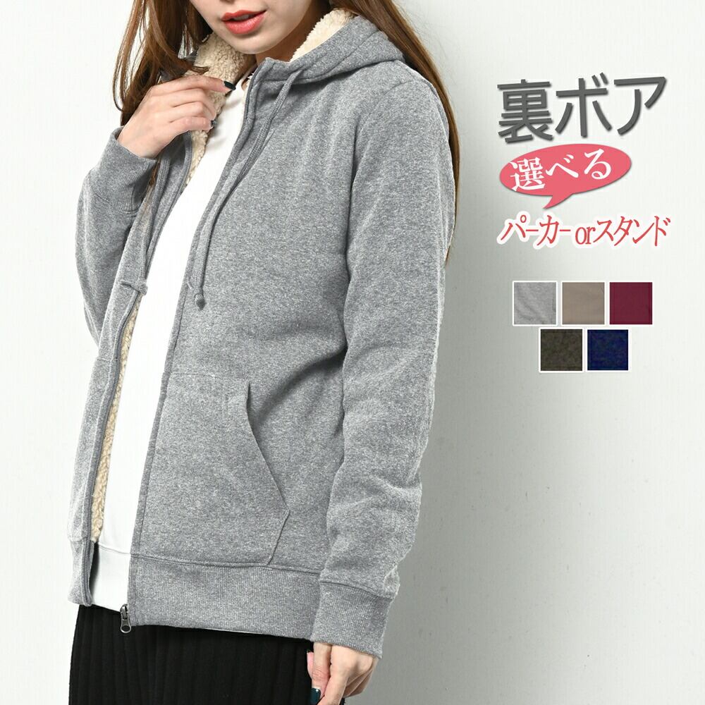 裏ボア パーカー ジャケット レディース ジップアップパーカー アウター カーディガン 秋 冬 裏起毛 裏フリース スウェット ジップアップ トレーナー 無地 フード付き フードなし 厚手 グレー ネイビー モカ ブラック アイボリー M L LL 大きいサイズ