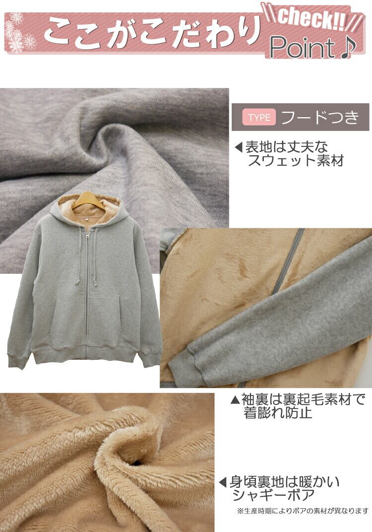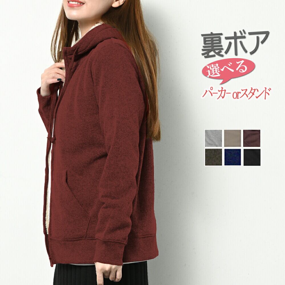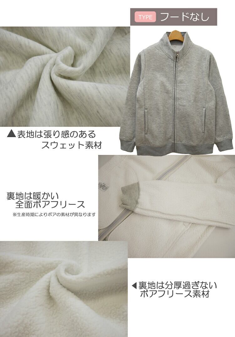 商品の特徴 裏ボアで保温性があるので、デイリーウェアにはもちろん防寒対策やルームウェアとしてもおすすめです。フード付きパーカーとスタンド襟の2タイプでラインナップ。