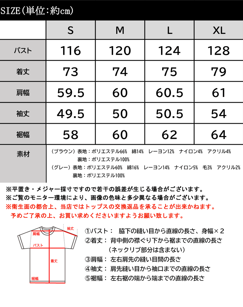 - Mサイズ:着丈: 55cm / 身幅: 62cm / 肩幅: 60cm / 袖丈: 46cm