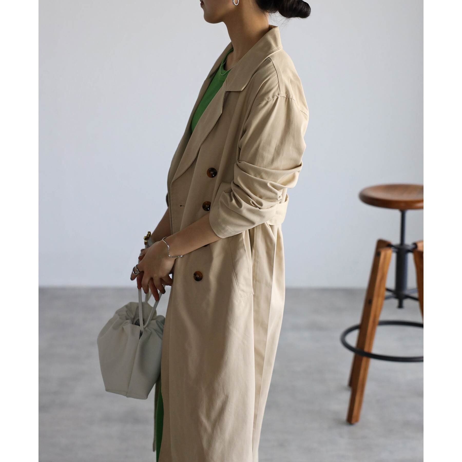 トレンドのオーバーシルエットを落とし込んだトレンチコート。スタンダードなデザインとゆったりしたシルエット。