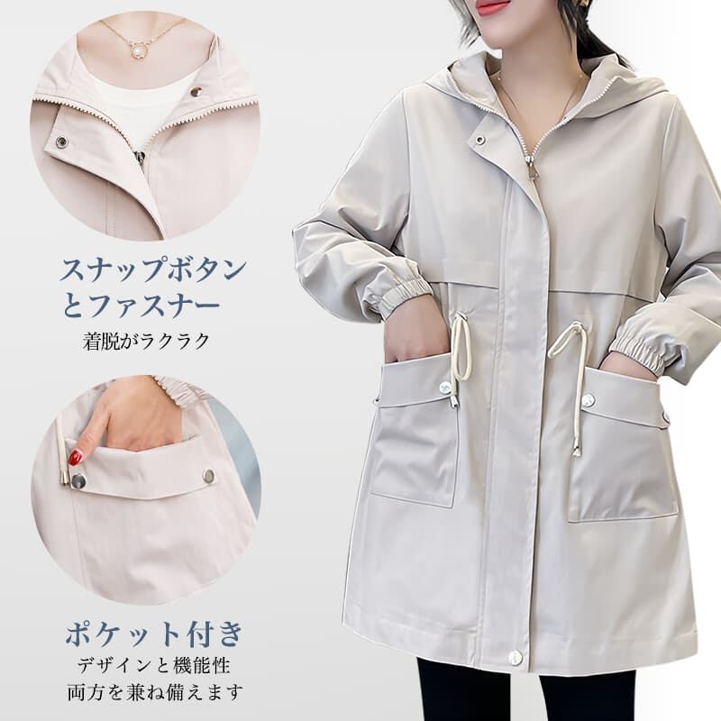 マウンテンパーカー レディース ウィンドブレーカー ブルゾン トレンチコート フード付き ドローコード コート ジャケット長袖 体型カバー パーカー スプリングコートアウター 軽量 通気 防風 春秋