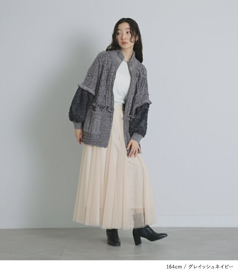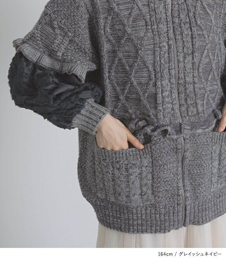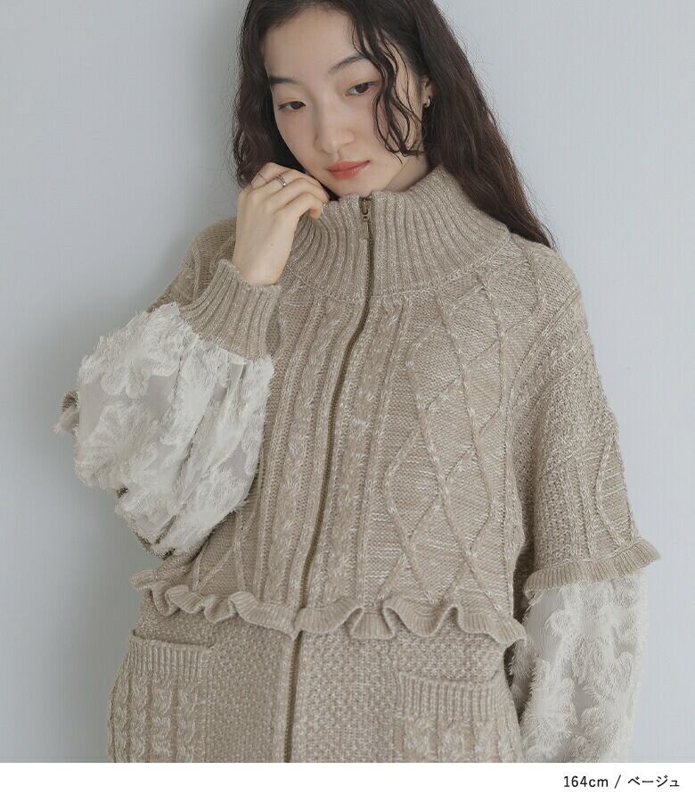 レディース トップス 羽織り ライトアウター ショートカーディガン ニットカーディガン ジップアップ ライトアウター ブルゾン ジャケット スタンドネック 立ち襟 長袖 ぽわん袖 袖コンシャス ショート丈ニット ドロップショルダー フリル 切り替え ケーブル編み 鹿の子編み フリンジカットジャカード 配色 異素材MIX ドッキング ジャガード ジャカード おうちで洗える 防寒 あったか もこもこ ふわふわ 秋冬春 女子会 カジュアル 通勤 通学 お買い物 お出掛け 旅行 大人女子 大人可愛い お洒落可愛い モード ナチュラル ニュアンス ラフ Sサイズ Mサイズ Lサイズ LLサイズ 3Lサイズ XLサイズ フリーサイズ ぽっちゃり 体型カバー 大きいサイズ 10代 20代 30代 40代 50代 60代 somari imagination ソマリイマジネーション ベージュ 紺 ネイビー グレイッシュネイビー バイカラー 【トップス】 【アウター】