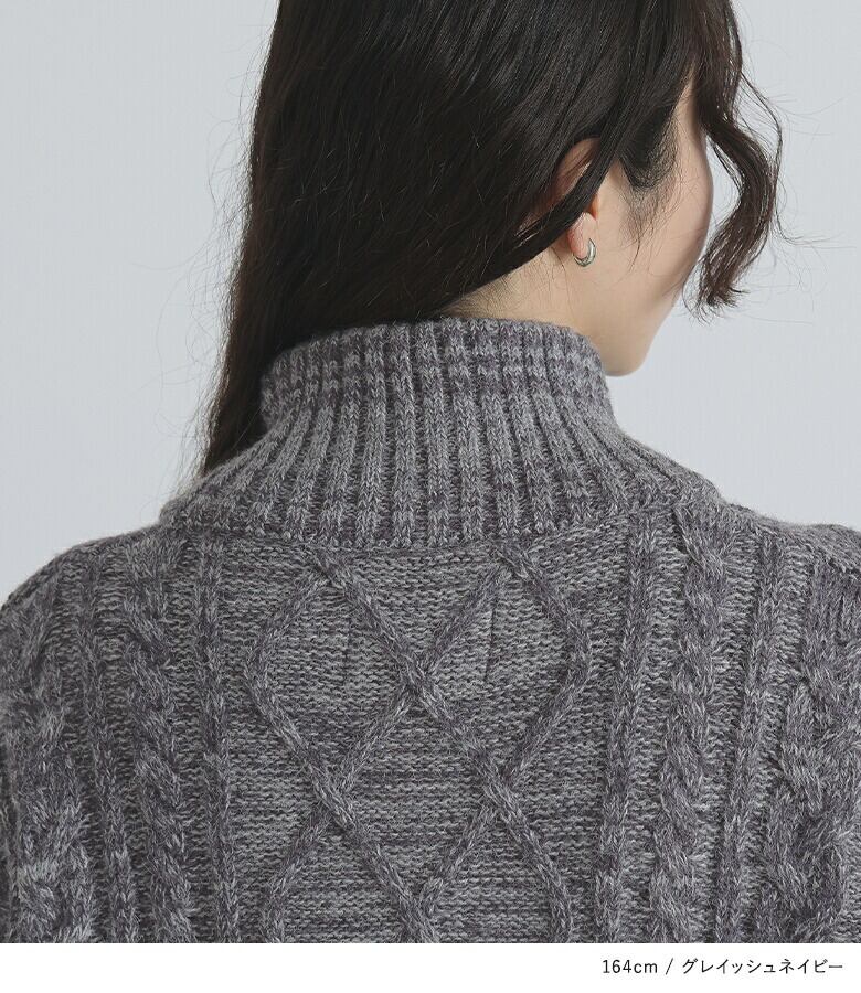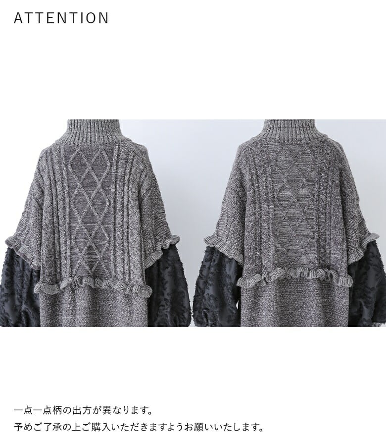 2色の糸をミックスしたさり気ない配色感がお洒落なニット生地。柔らかくしっかりと厚みがあるのでロングシーズン活躍します。編地もケーブル編みやカノコ編みなど変化をつけたデザイン。袖部分はニット生地と配色のカットジャカード生地で切り替えました。抽象的な花柄がポイントに。