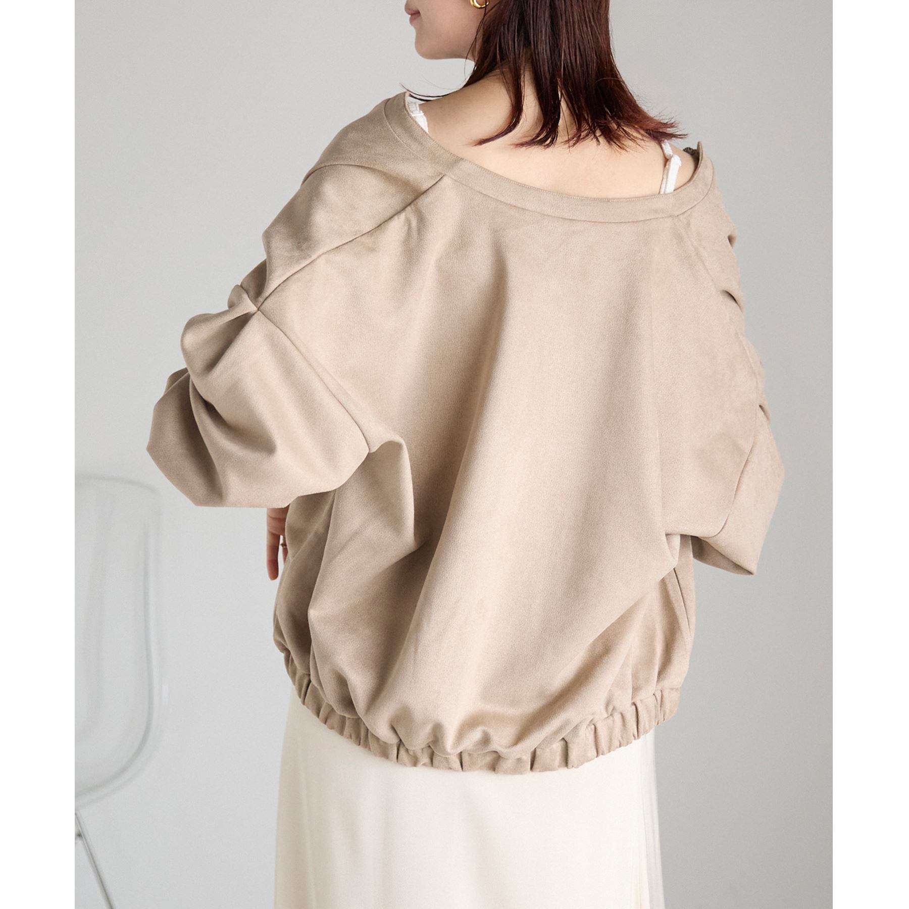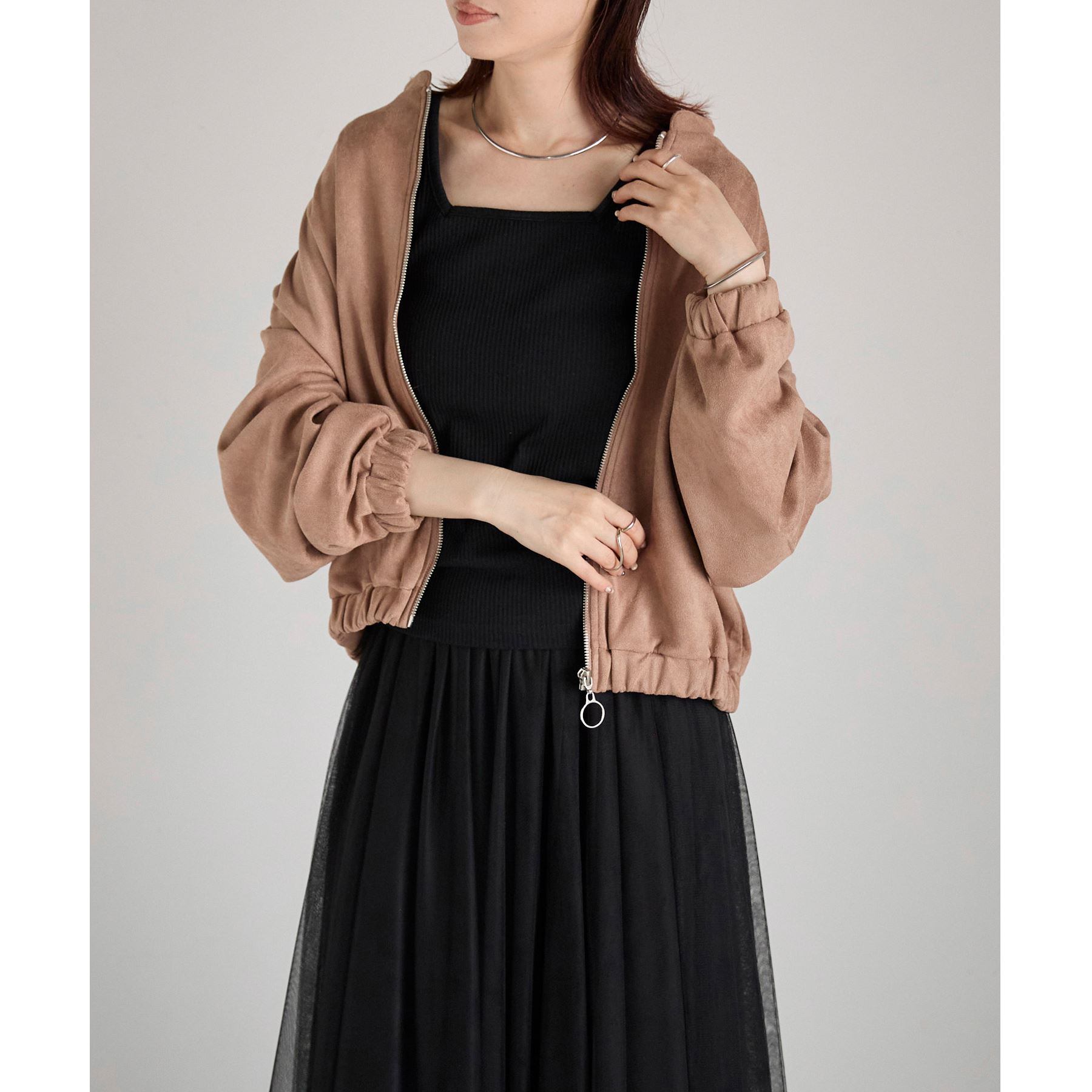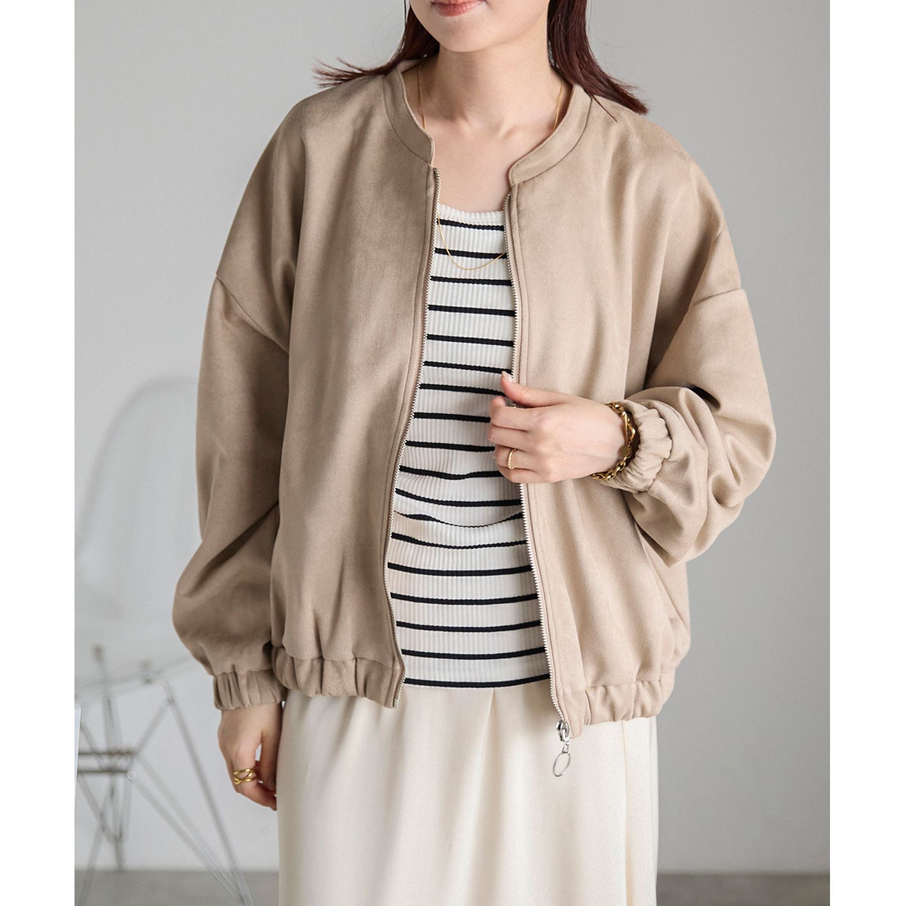 さっと羽織れて便利なフロントジップブルゾンは、スエードの風合いがカジュアルすぎず女性らしい雰囲気に。