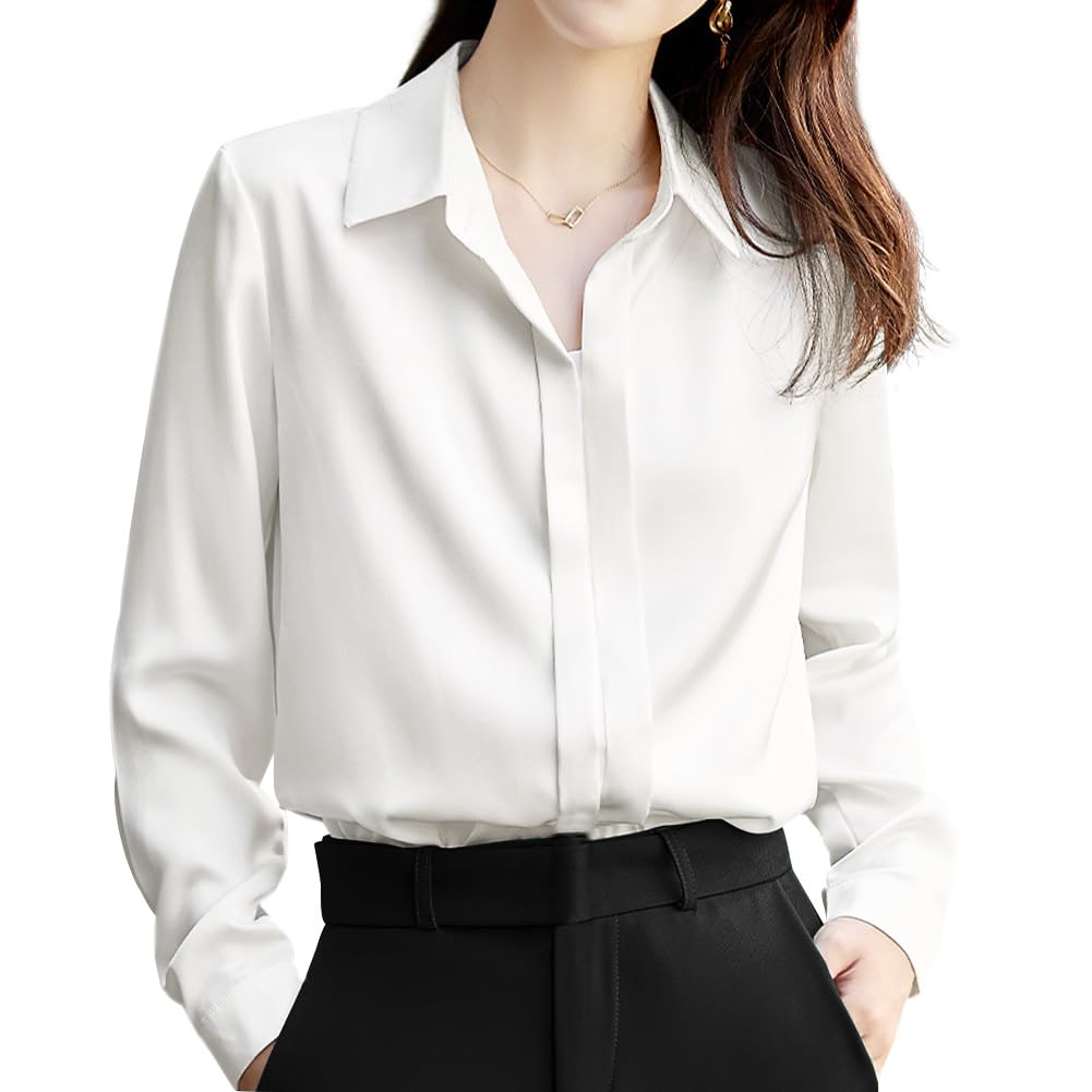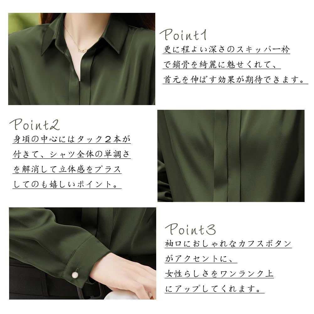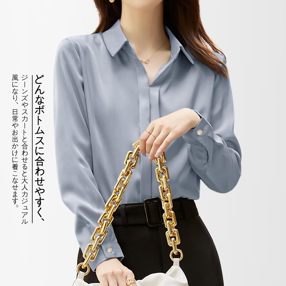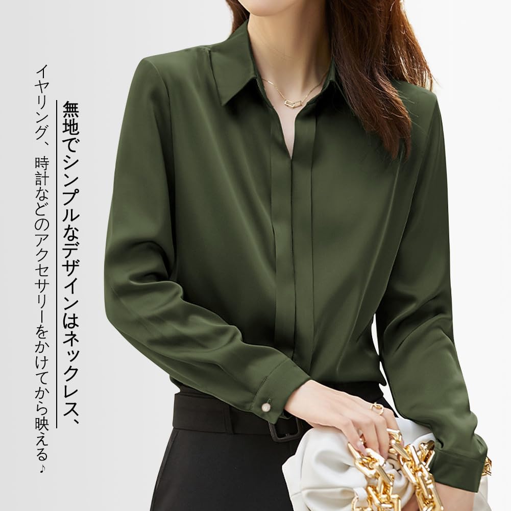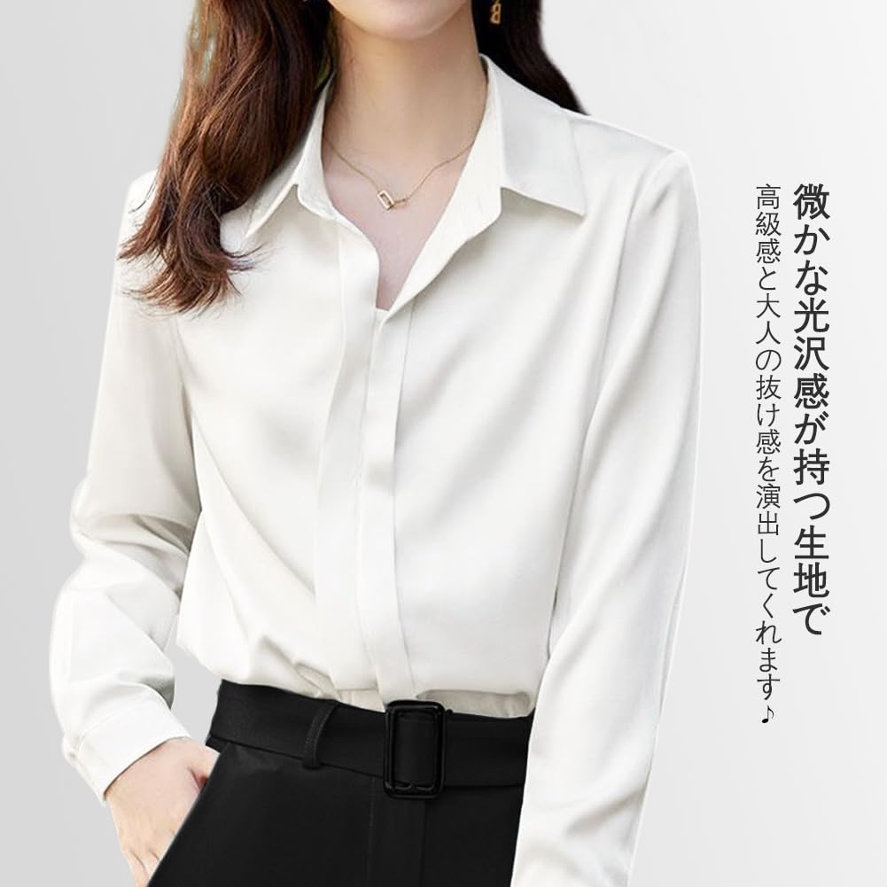 シャツ ブラウス レディース【エレガントなサテン素材・着痩せ効果抜群】シンプルで洗練されたデザインの長袖トップスです。日常やオフィスシーンを美しく彩る一着をご紹介します!
