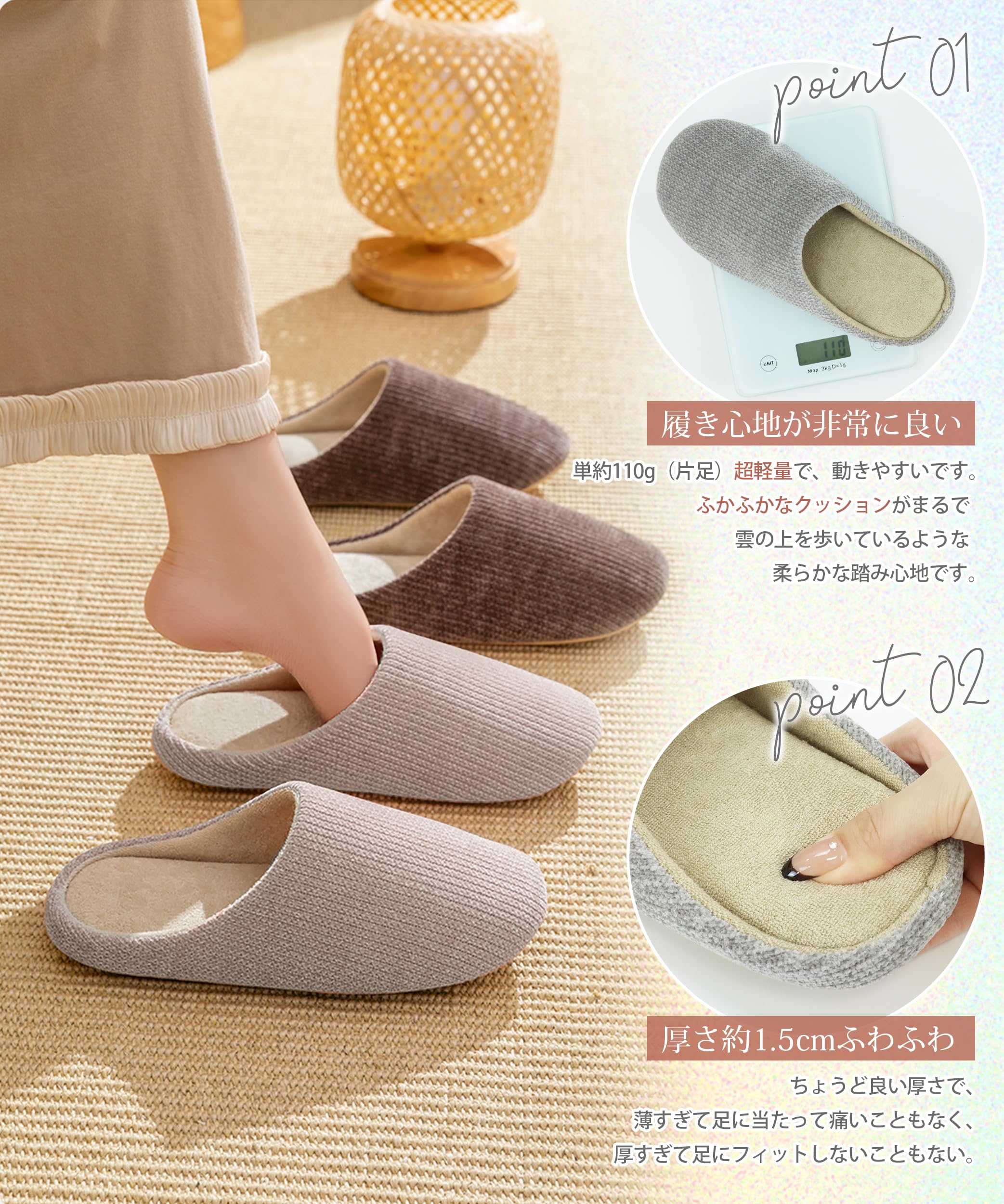 1秒で立定滑り止め機能が付いているため、滑りやすい床でも安心。耐久性に優れ、消音設計により、歩く音を気にせずくつろげます!