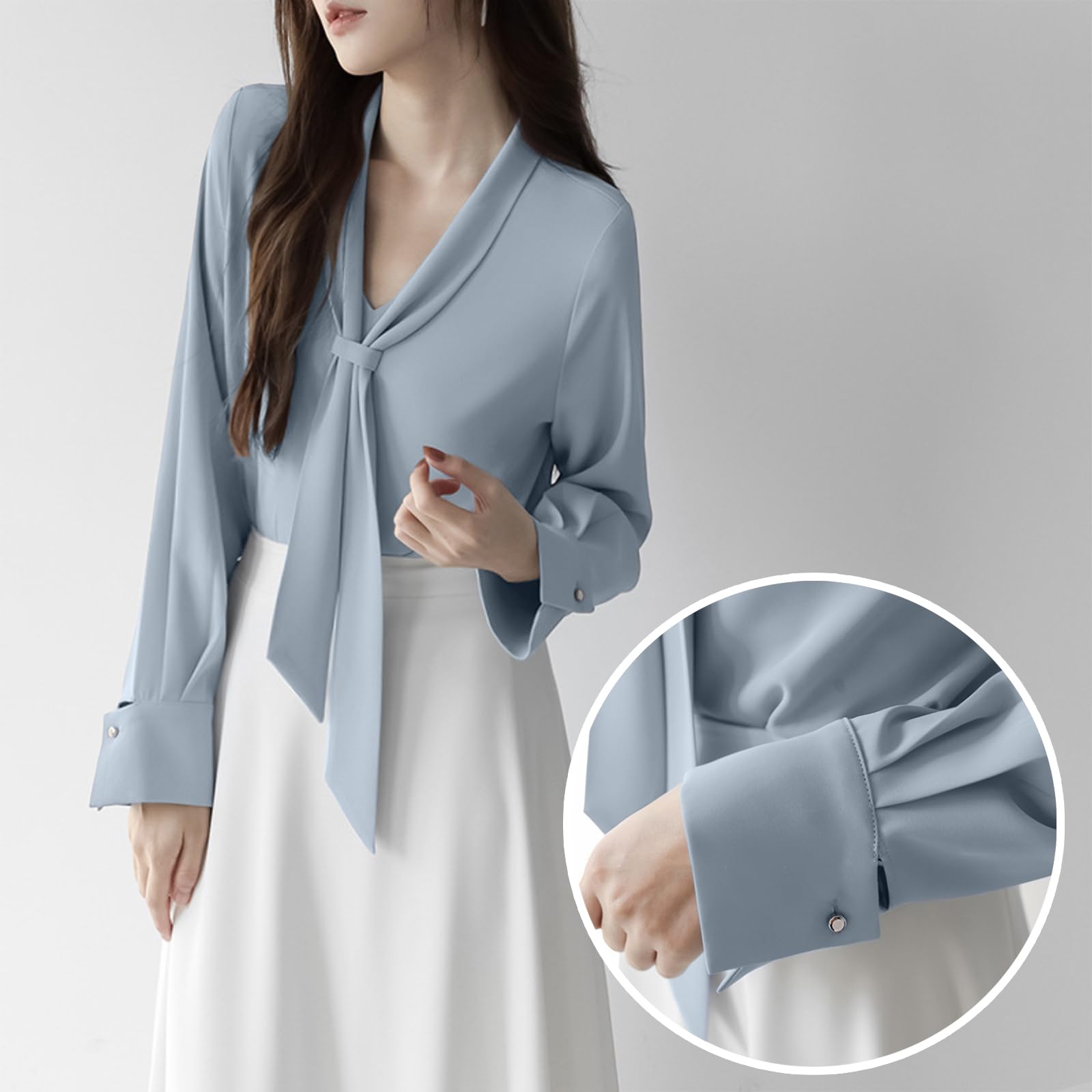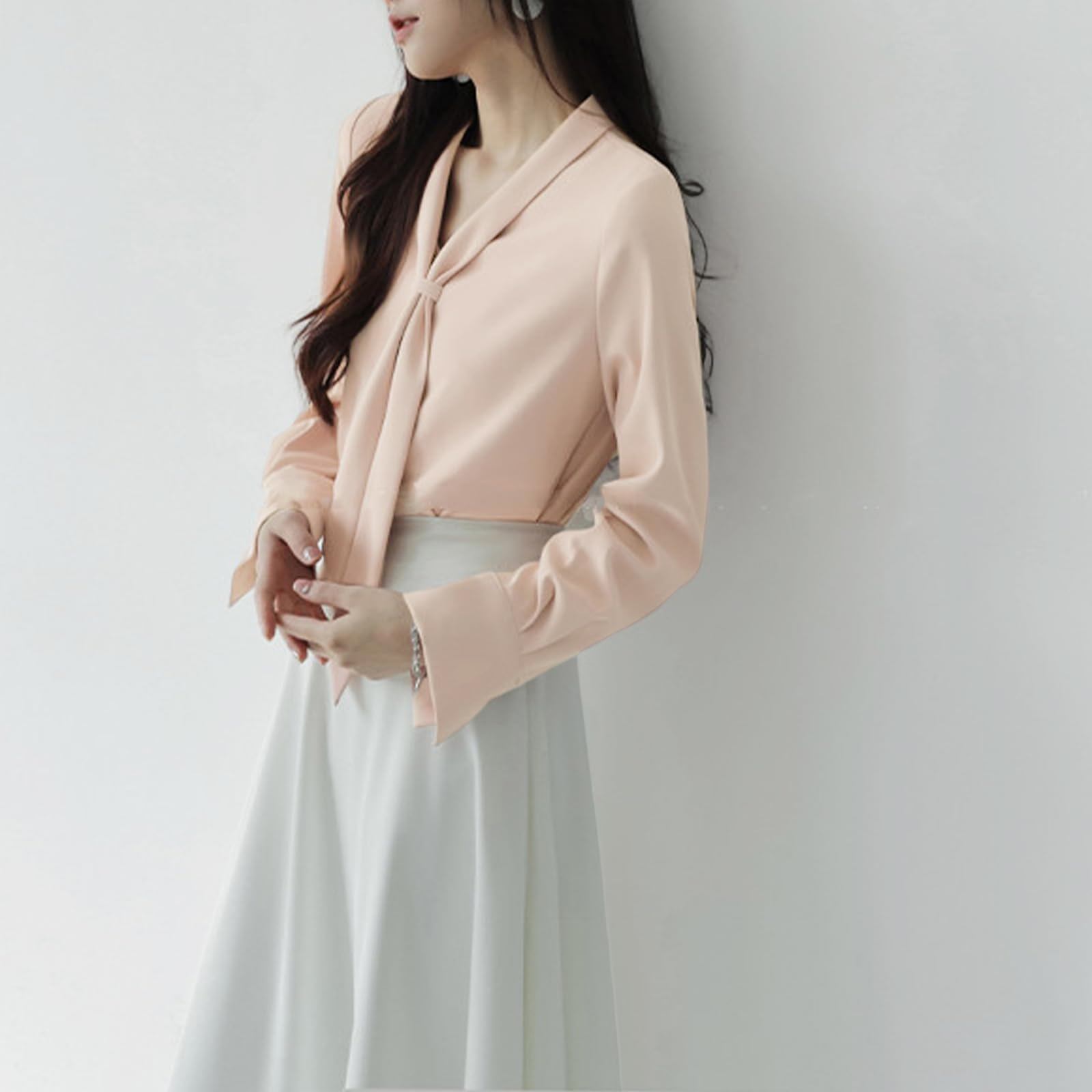 上品なボウタイブラウス:無地×シンプルなデザインで、洗練された落ち着きのある大人スタイルを演出。一枚でコーデが決まり、デイリーにもオフィスにもぴったり。ゆったりとしたシルエットで体型をカバーしつつ、すっきり細見え効果も抜群です