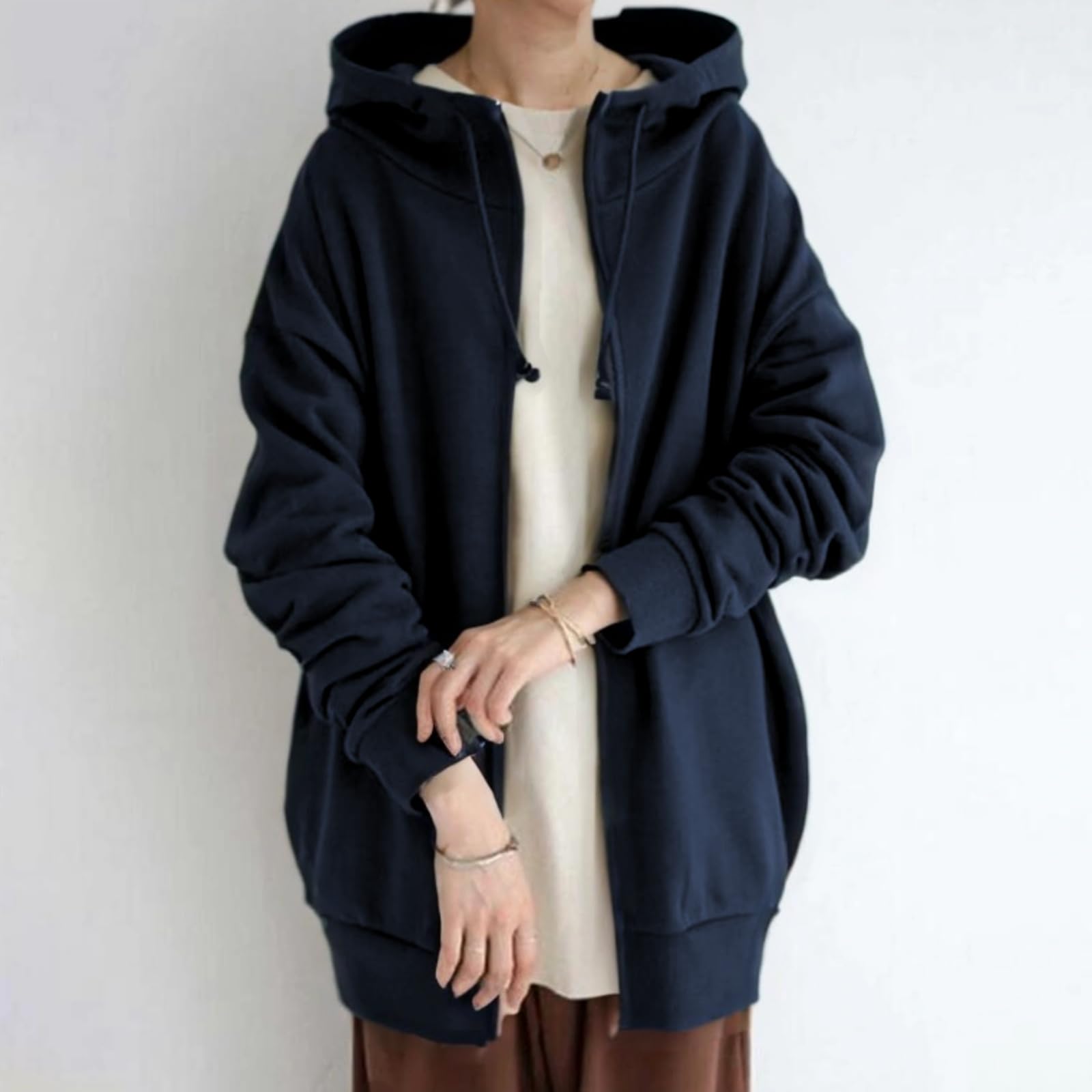 秋冬に欠かせないパーカー:今トレンドのビッグシルエットのフード付きトレーナーが登場。大きめのフードとジップアップ仕様で、首元までしっかり包み込むデザインで暖かい!鮮やかすぎない地味もない色味で、デイリーにもオフィスにも一枚でコーデが広がります