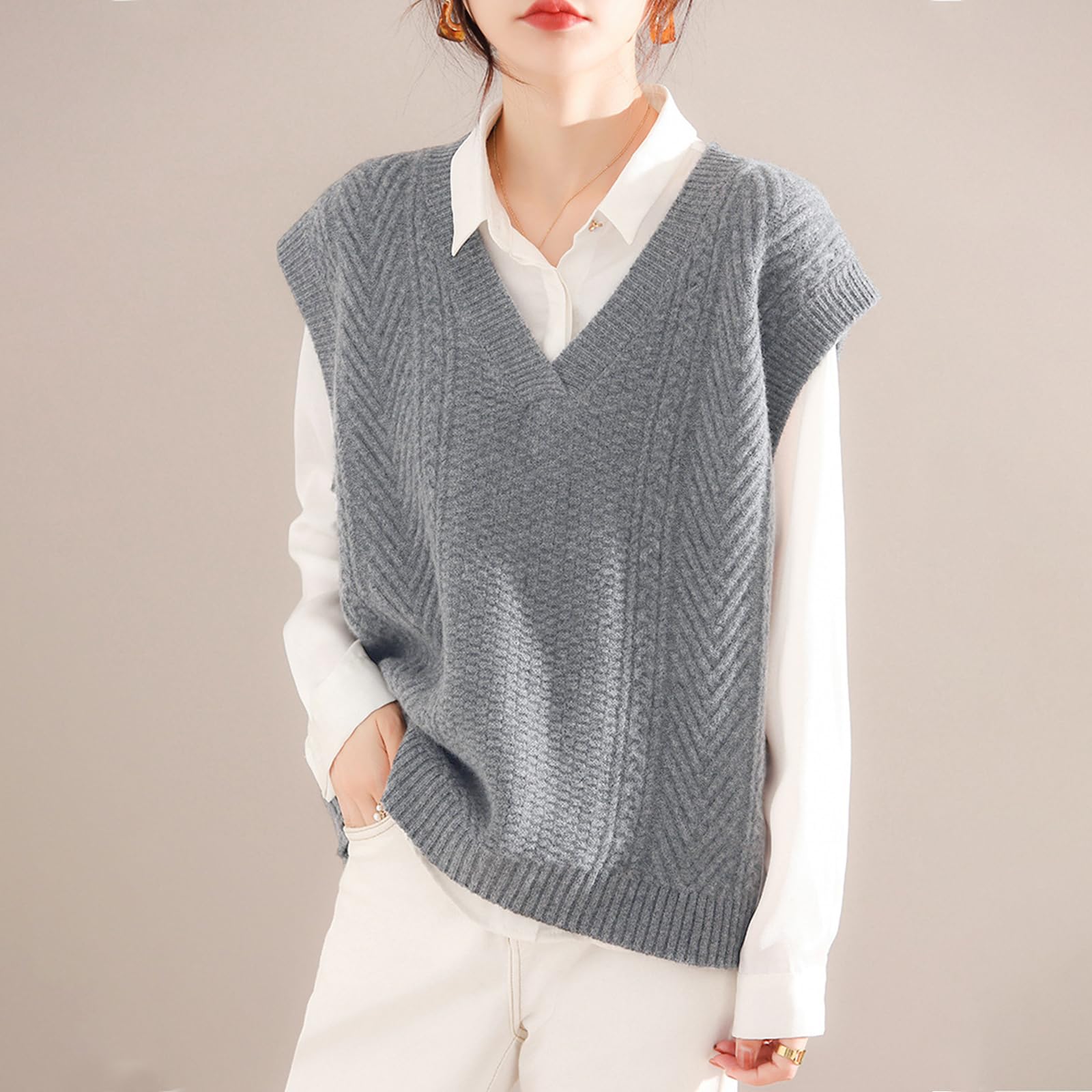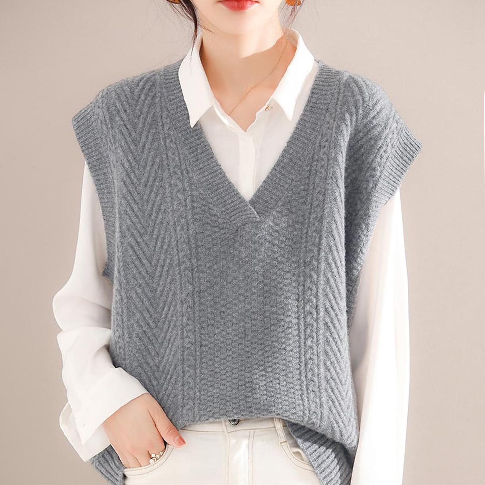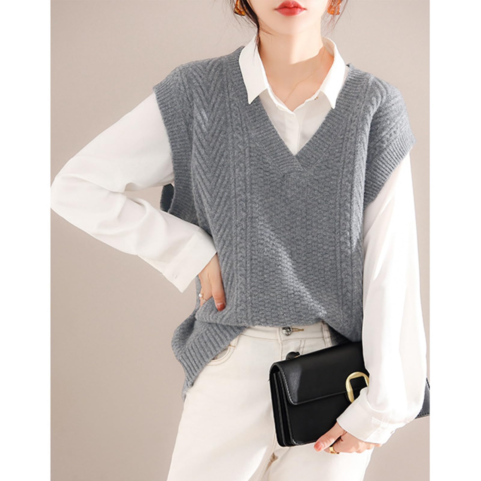 上品なVネックベスト:シンプルで飽きない無地ベストで洗練された大人らしい印象を作り出し、デイリーにもオフィスにも一枚でコーデが広がります。春から秋までは薄手アウターとして、真冬に防寒セーターに、一枚持ってロングシーズンで重ね着風コーデを楽しめます