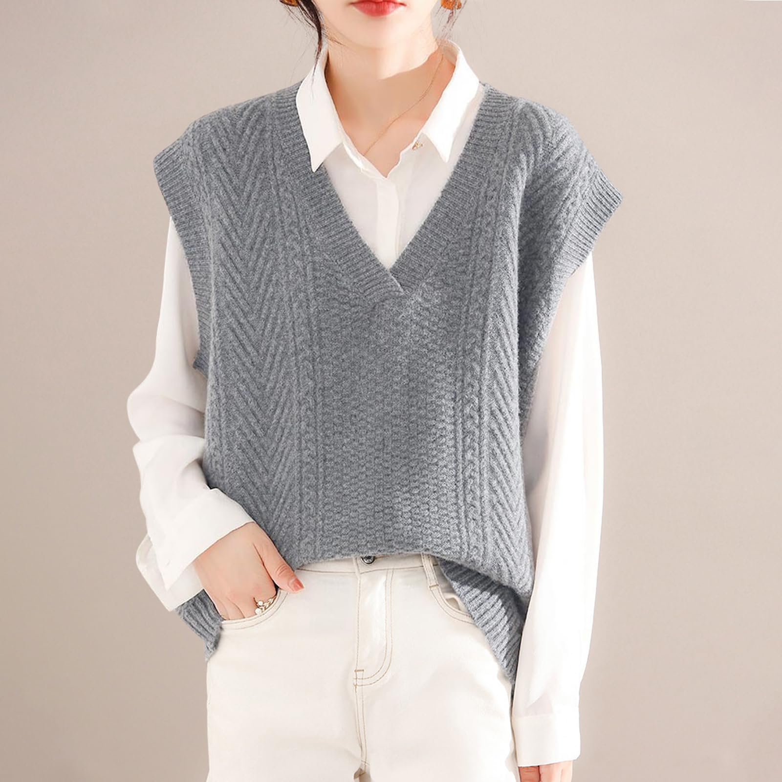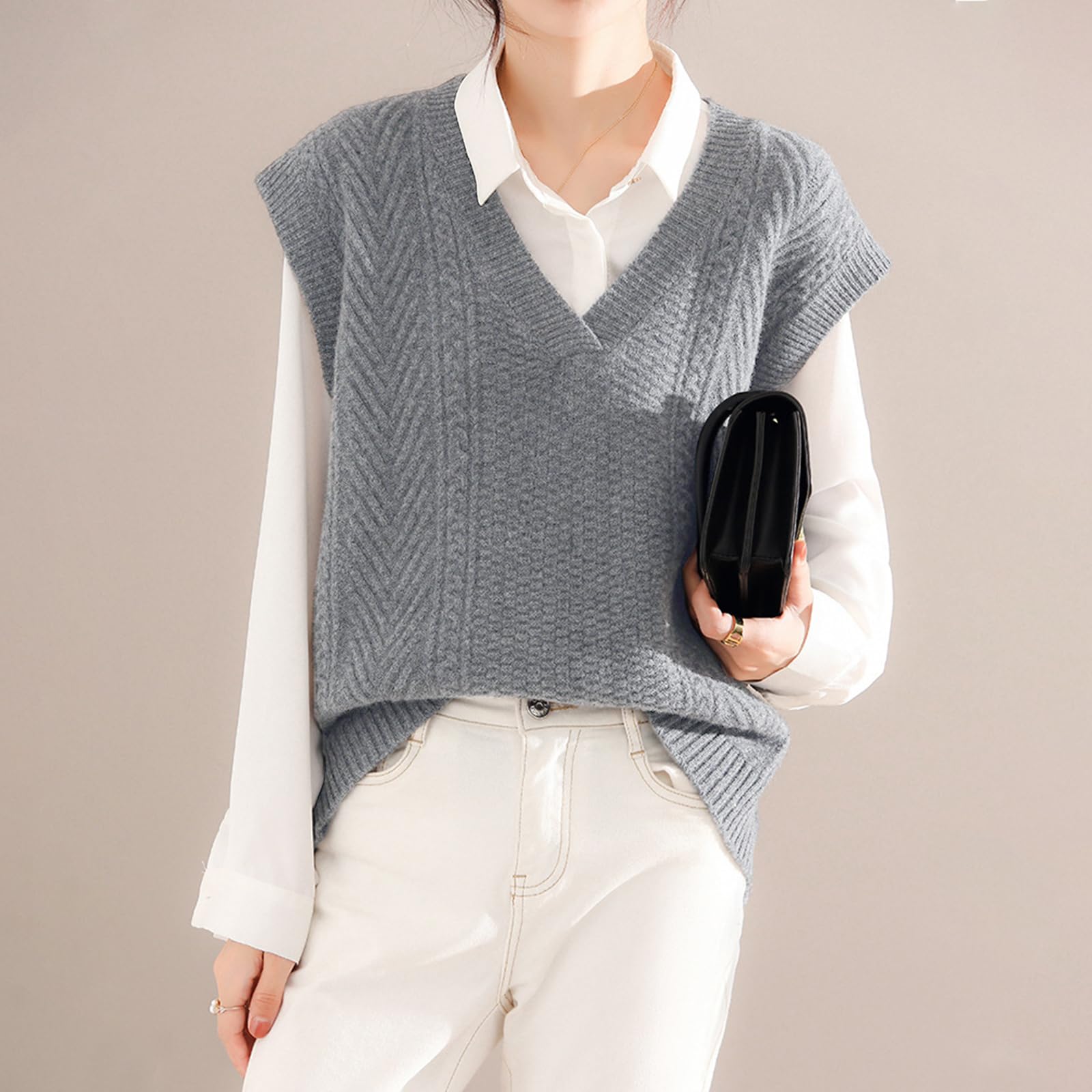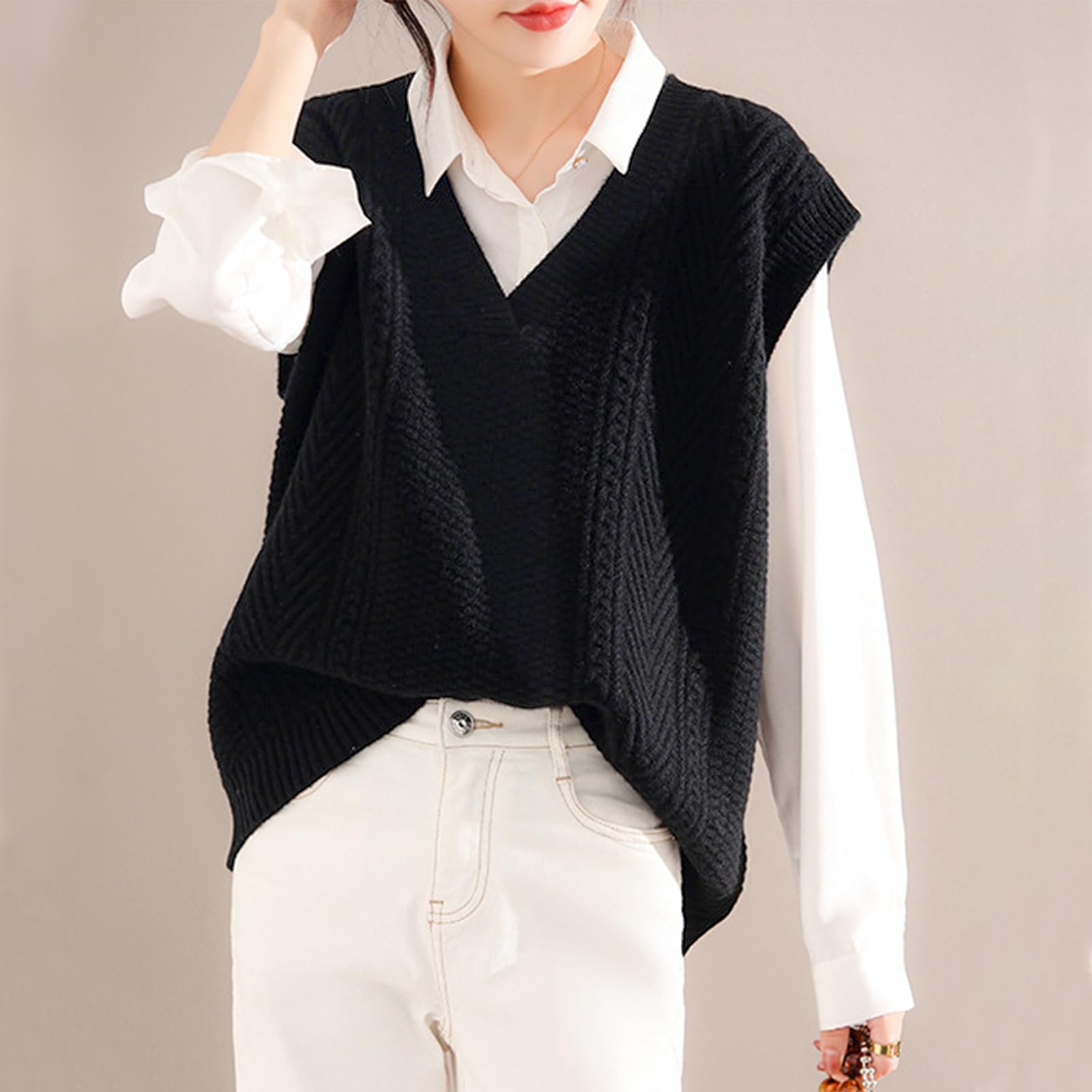 上品なVネックベスト:シンプルで飽きない無地ベストで洗練された大人らしい印象を作り出し、デイリーにもオフィスにも一枚でコーデが広がります。春から秋までは薄手アウターとして、真冬に防寒セーターに、一枚持ってロングシーズンで重ね着風コーデを楽しめます