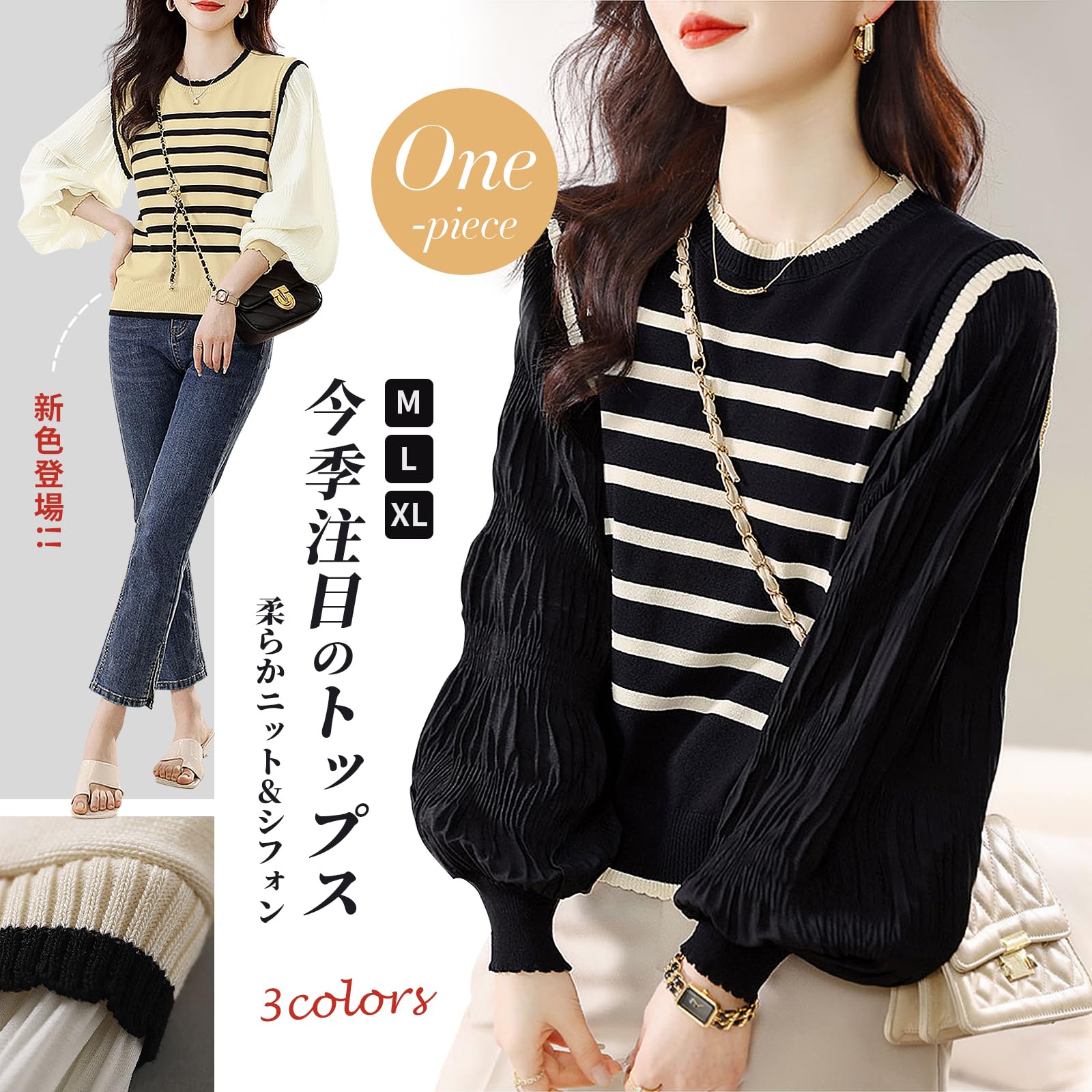 ブラウス 切り替え レディース ボーダー柄ニット ドッキングブラウス トップス バルーンスリーブ シャツ カットソー長袖 クルーネック フリル シアー ファッション カラフル カジュアル 着痩せ 着心地 可愛い オフィス 通勤 春 秋