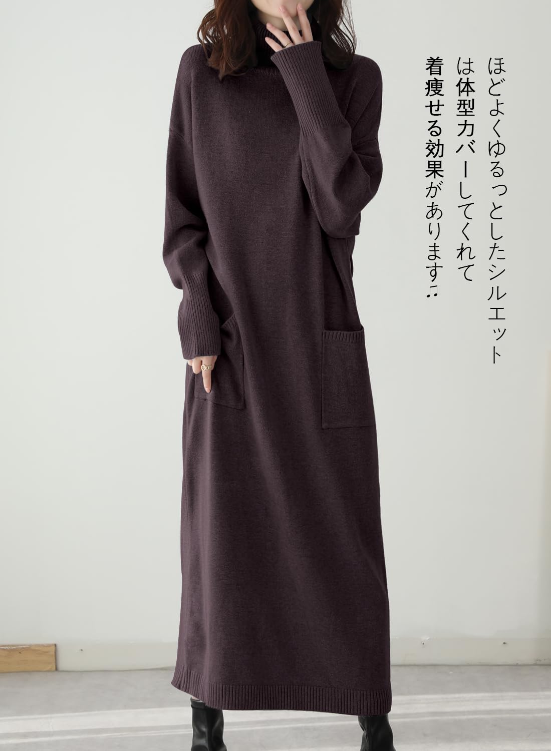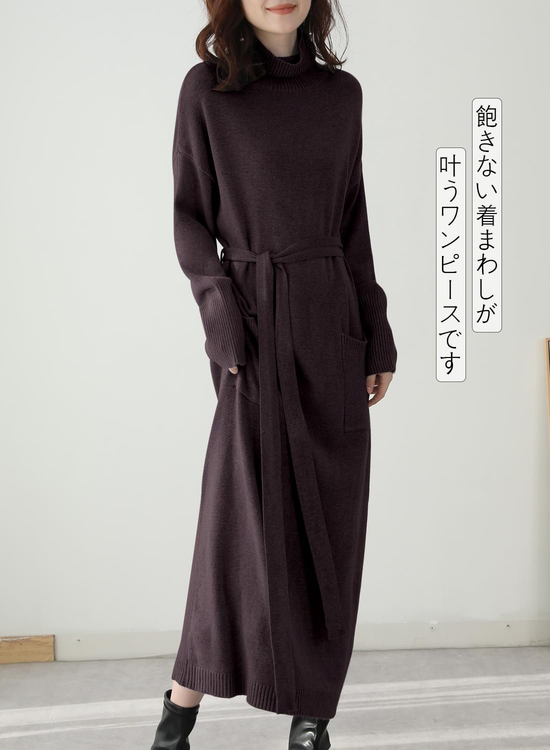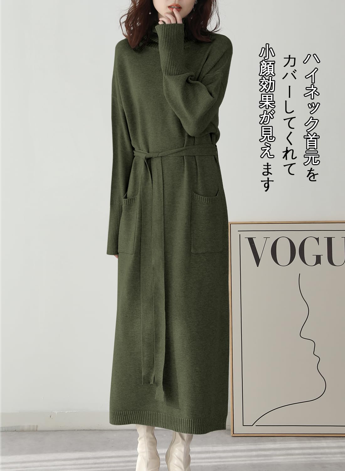 ★シンプルなハイネックレディースロングワンピースです。ハイネック首元をカバーしてくれて小顔効果が見えます。ほどよくゆるっとしたシルエットは体型カバーしてくれて着痩せる効果があります。ウエストに付けるニットリボンをつけたらメリハリ感が演出してくれます。柔らかくて保温性が良い素材で作られたのでチクチク感がなく、肌触りが良くて暖かいセーターです。ストレッチ性が富むので窮屈感がなく、良い着心地になります。これからの秋と冬に不欠かせるニットワンピースです。