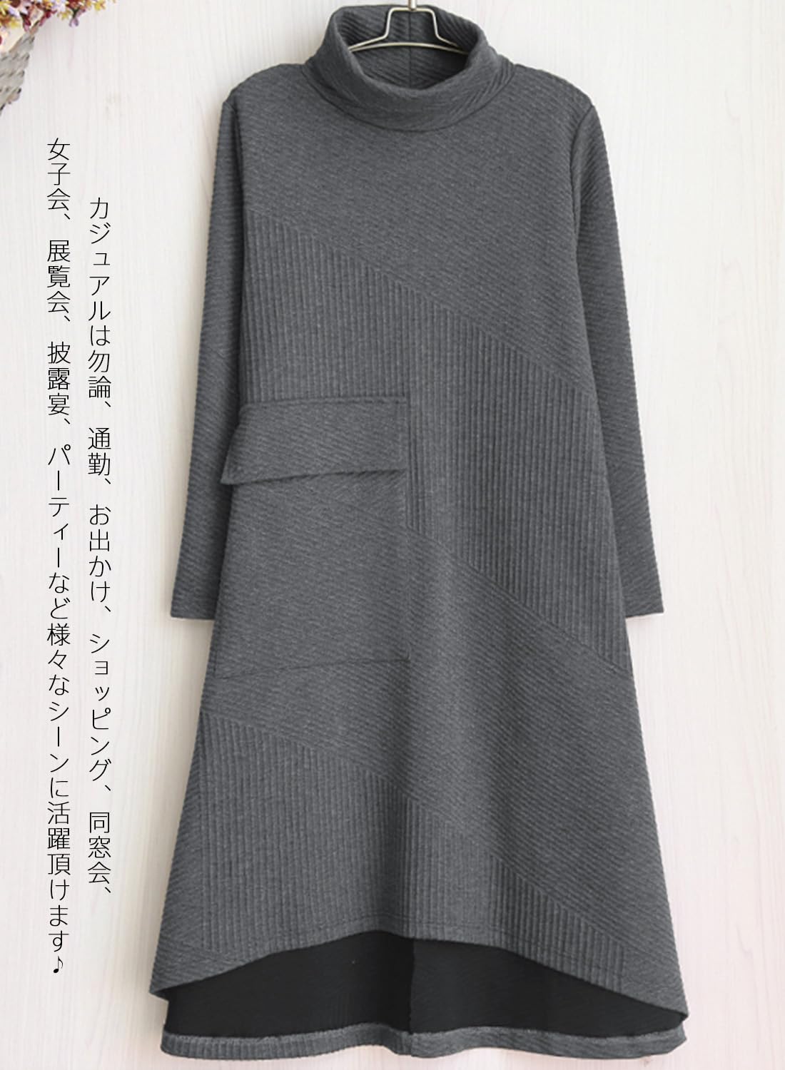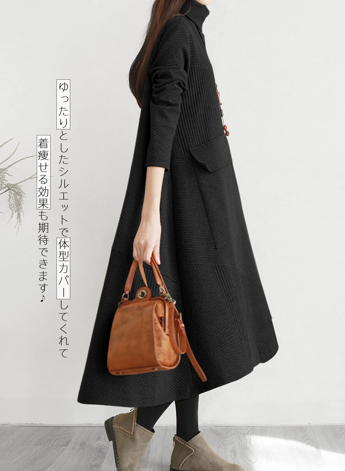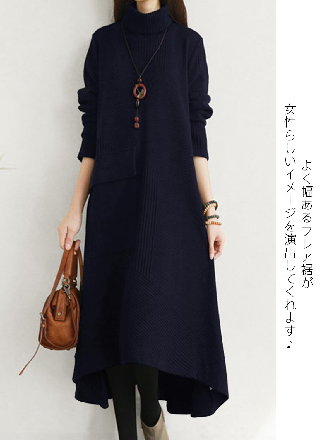 ★ナチュラルなハイネックのレディースロングワンピースが今季に登場しました。ゆったりとしたシルエットで体型カバーしてくれて着痩せる効果も期待できます。シンプルなデザインで、お洒落でエレガントな大人の女性のイメージを作ってくれます。しっかりとした厚みで保温力があります。これからの秋と冬にご活躍頂けるAラインのワンピースです。