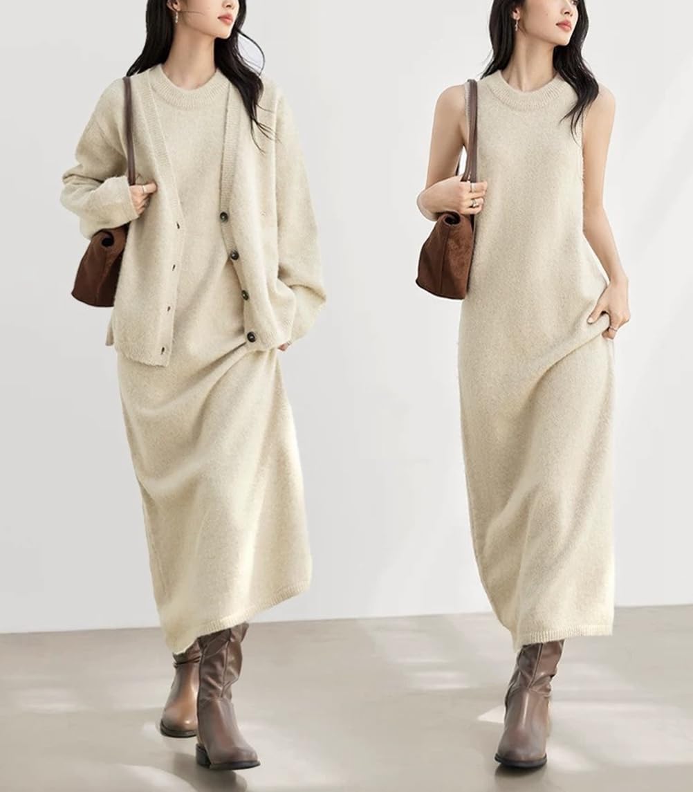セットアップ 上下セット ニットワンピース ニットカーディガン 2点セット レディース ノースリーブワンピース 長袖カーディガン 着やせ 上品 エレガント 秋冬ドレス 結婚式 二次会 きれいめ カジュアル 通勤 春 秋 冬