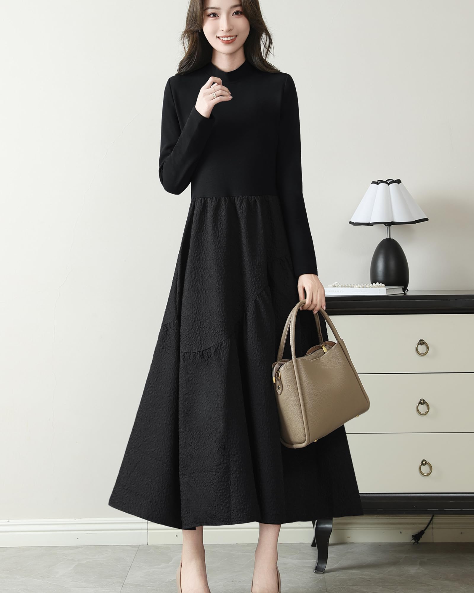 ワンピース レディース エンボス加工 ミモレ 切り替え ハイウエスト モックネック 長袖 体型カバー 着瘦せ 女性らしい 可愛い きれいめ おしゃれ ドレス カジュアル 通勤 普段着 春 秋