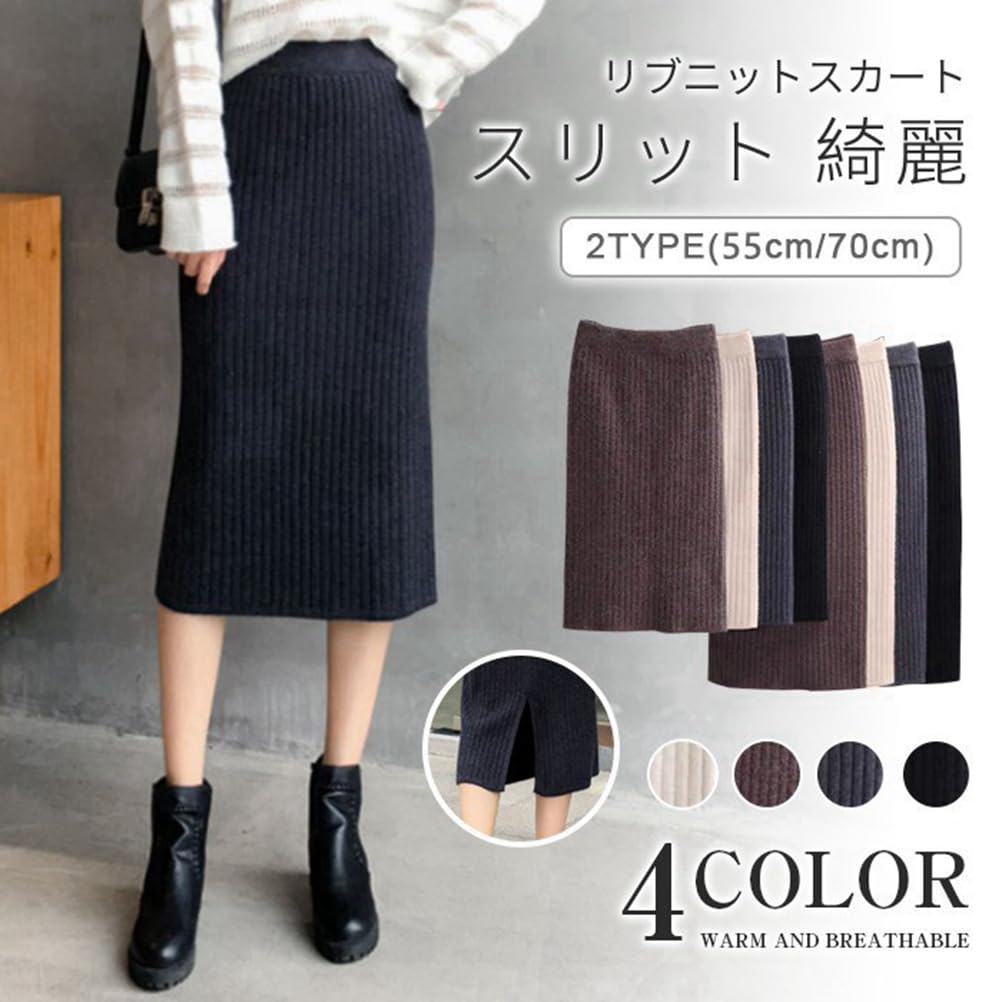 【商品名】ニットスカート レディース タイトスカート リブ スリット 膝丈 ストレッチ ミモレ丈 ボトムズ ひざ丈 ロング丈 秋 春 冬