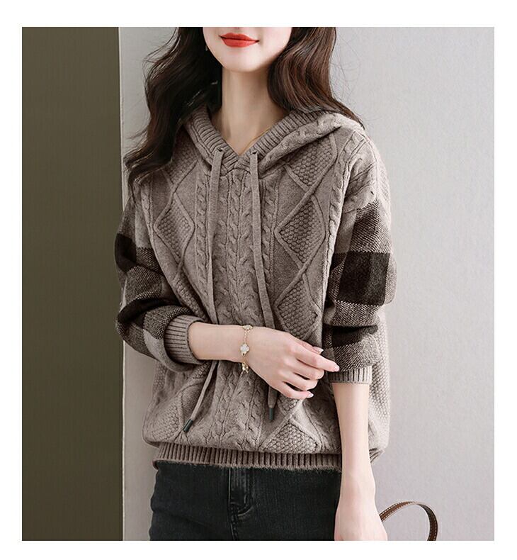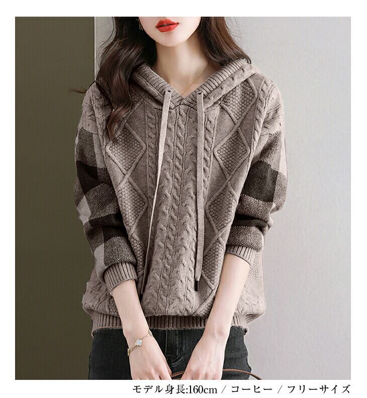 ポイント ケーブル編みの立体感とフード付きデザインが魅力の長袖ニット。