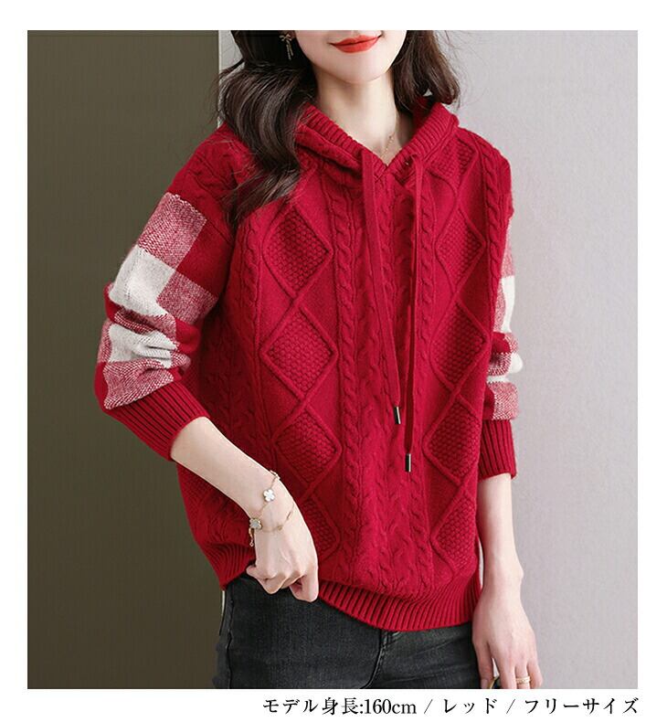 ケーブル編みボーダー袖フード付きニット レディース ニット パーカー ケーブル編み ストライプ袖 長袖 体型カバー カジュアル 春 秋 冬 20代 30代 40代 50代 ワンピスター