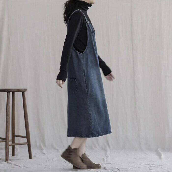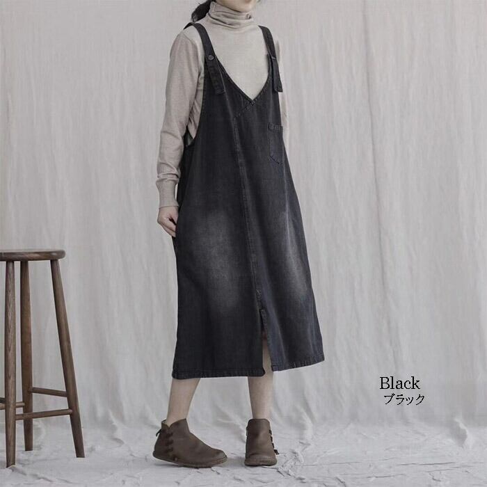 サロペット デニム ジャンパースカート ワンピース オーバーオール ワンピ オールインワン スカート ジャンスカ ユーズド加工 ウォッシュ加工 ゆったり ミモレ丈 大人女子 カジュアル 大人 可愛い オールシーズン 春 秋 冬