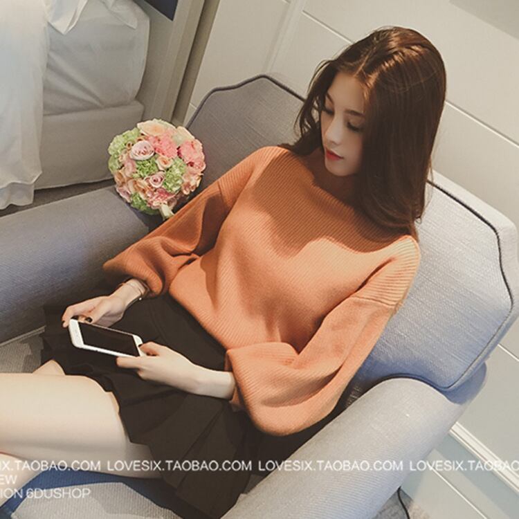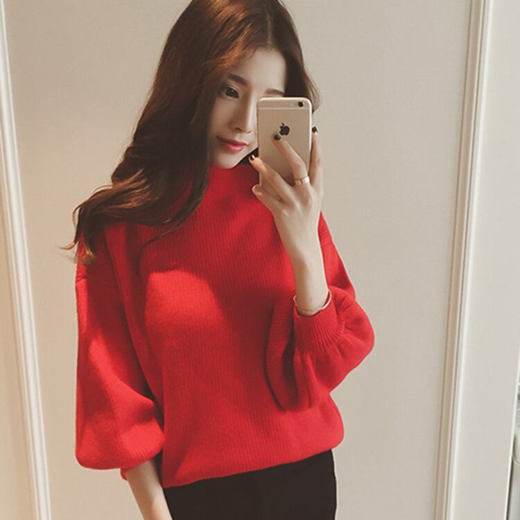 プルオーバー レディース ニット トップス スタンドカラー パフスリーブ 韓国風 新作 無地 ゆったり