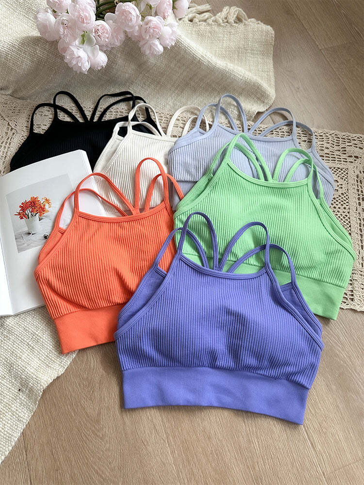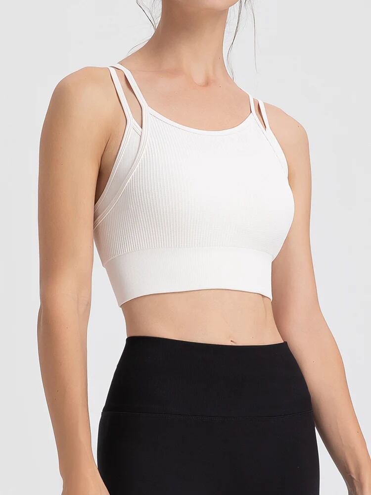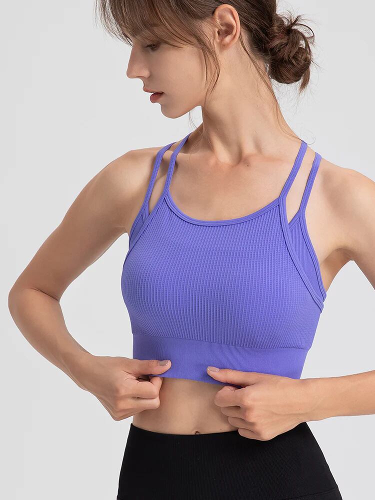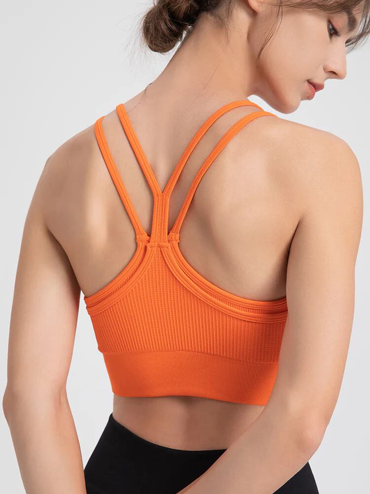 背中にはオシャレなYバックデザイン。肩甲骨の動きをさまたげにくくなり、肩紐がずり落ちなくて運動に集中できる。