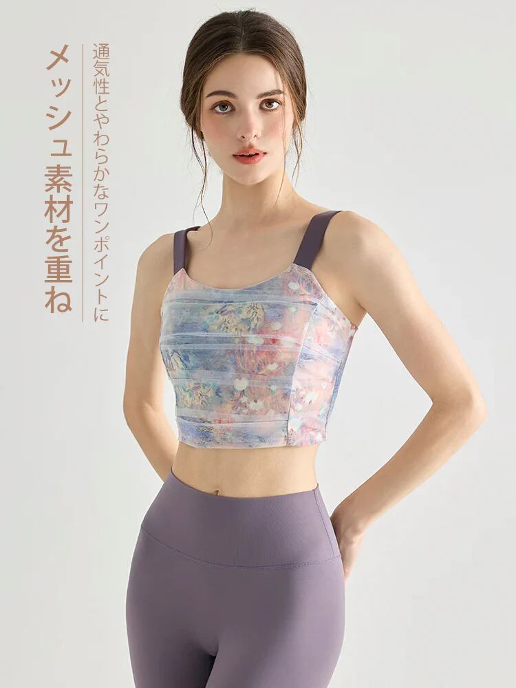 表地にメッシュ素材を重ねることで、通気性とデザイン性を両立させたスポーツブラです。