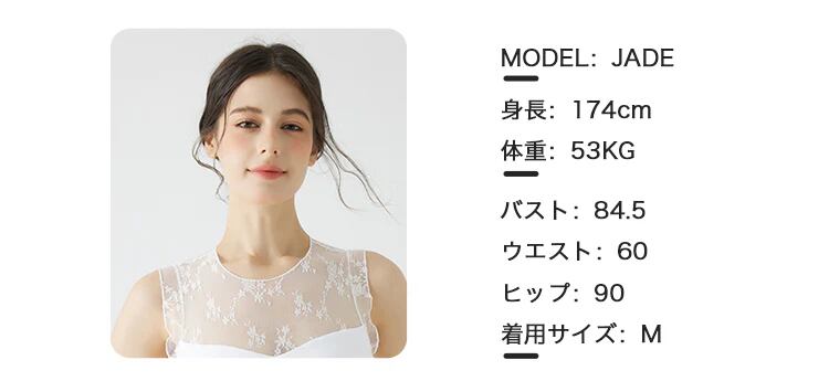 デコルテまわりとバックのレース使いが華やかさを演出するポイントで、さりげない肌見せを叶え、フェミニンムードを高めてくれる。