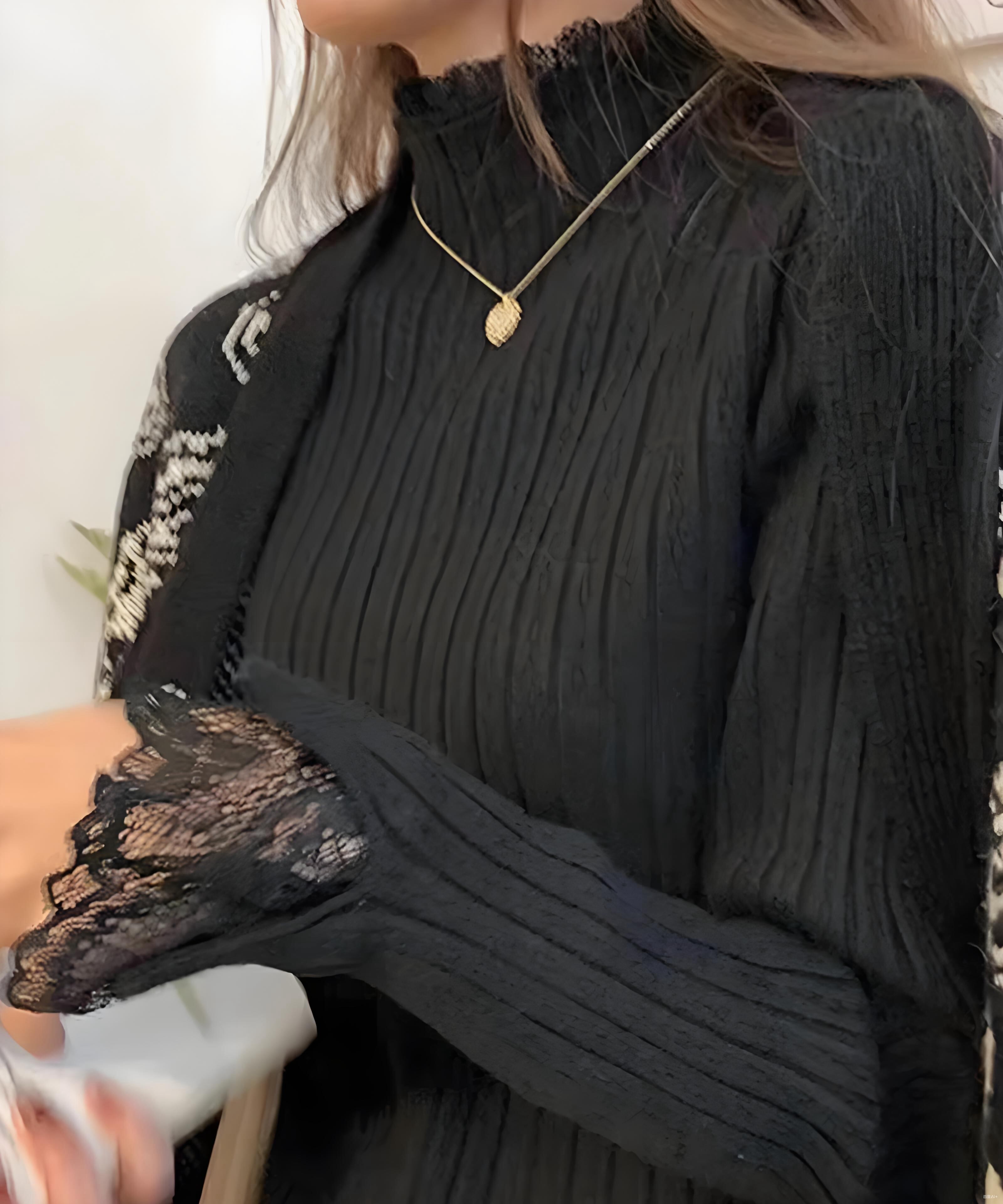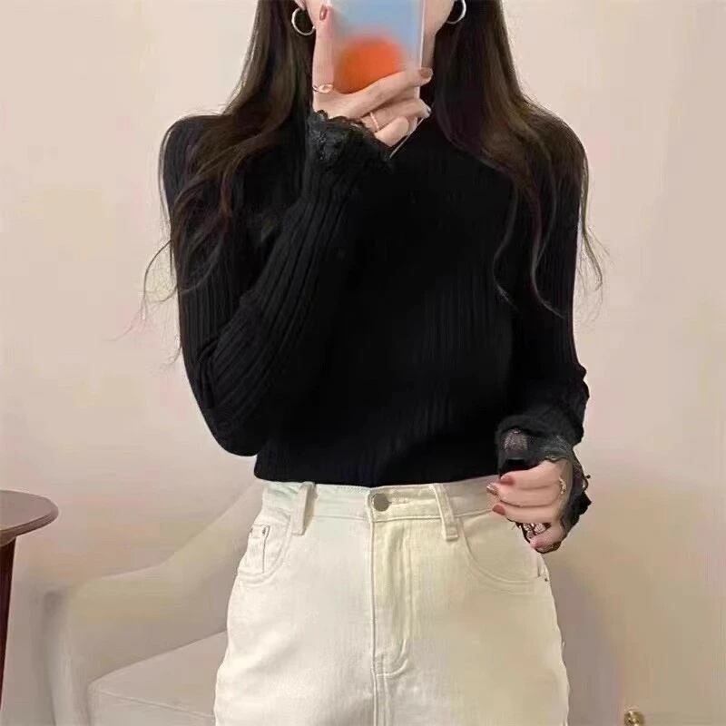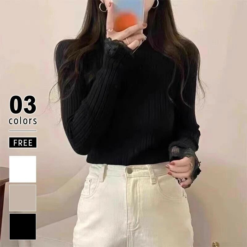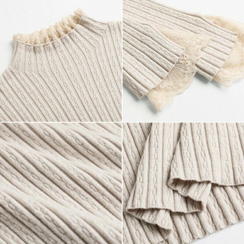 可愛いフリルネックとレースデザインが特徴の「ニット 袖レース ハイネック トップス」は、秋冬にぴったりのアイテムです♪