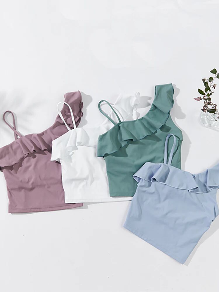 アシンメトリーなデザインが個性的な印象を与えるフリルキャミブラです。片側のフリルが華やかさをプラスし、女性らしいシルエットを美しく際立たせます。着心地も良く、ブラカップは取り外し不可の仕様でしっかりとバストを支えますので、一枚で安心してお楽しみいただけます。軽やかな素材感は、涼しげな印象を与え、これからの季節にぴったりのアイテムです。