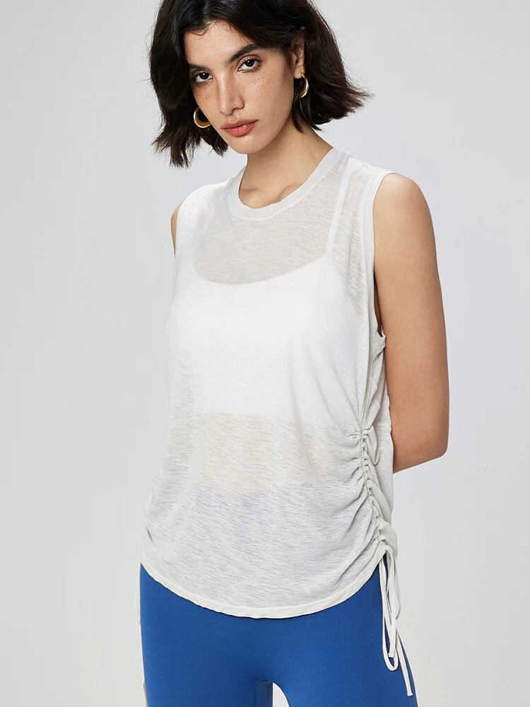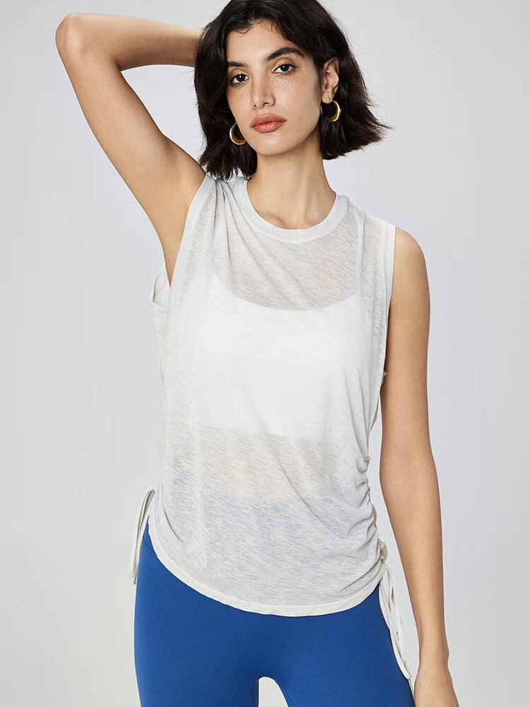 薄い生地で通気性が高く、ヨガなどでの運動時はもちろん、ホットヨガウェアとしても着用できる嬉しい一枚です。
