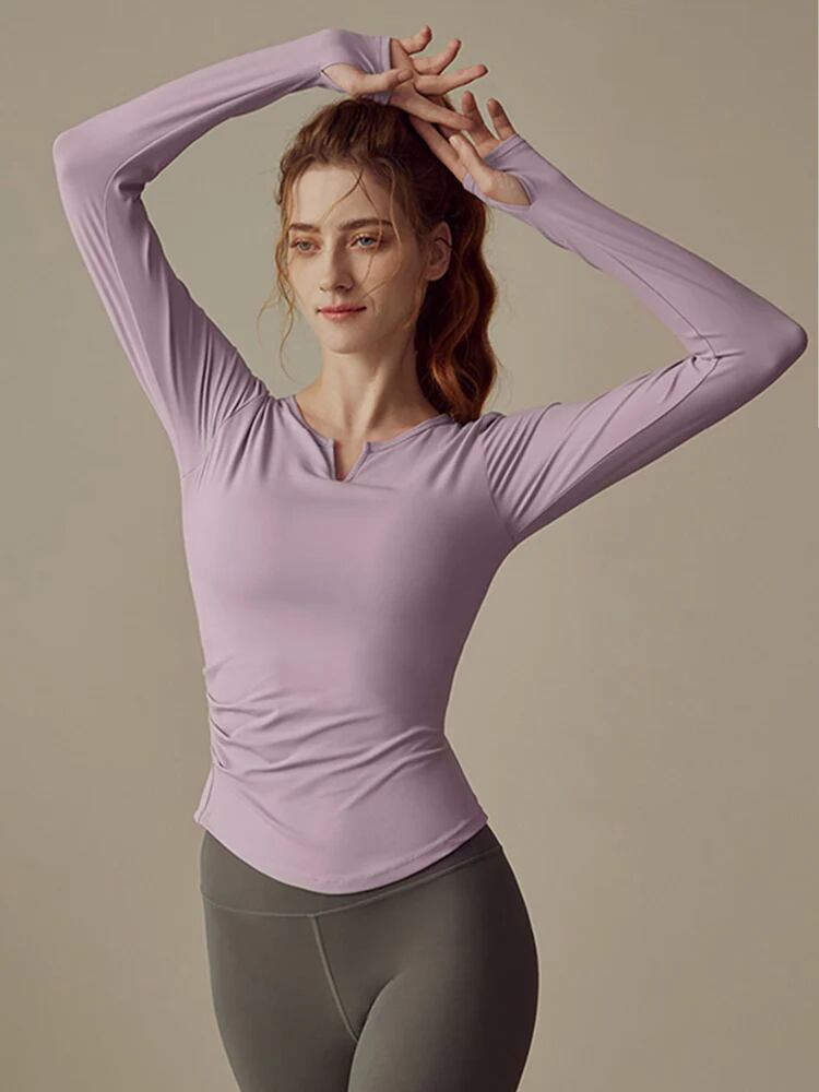 ラウンドネックにV字カットデザインは、ネックラインを視覚的に引き伸ばし、またネックを解放します。