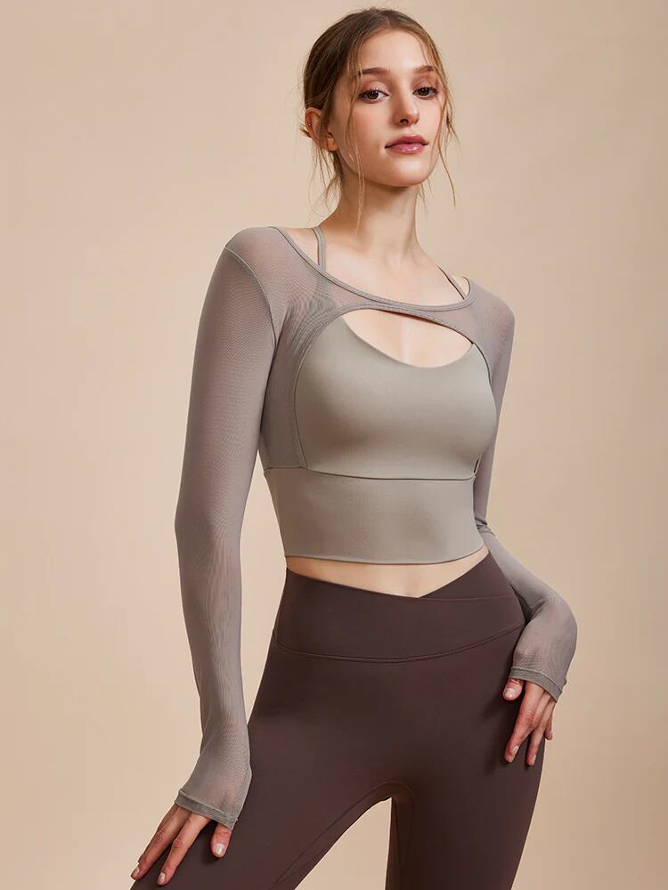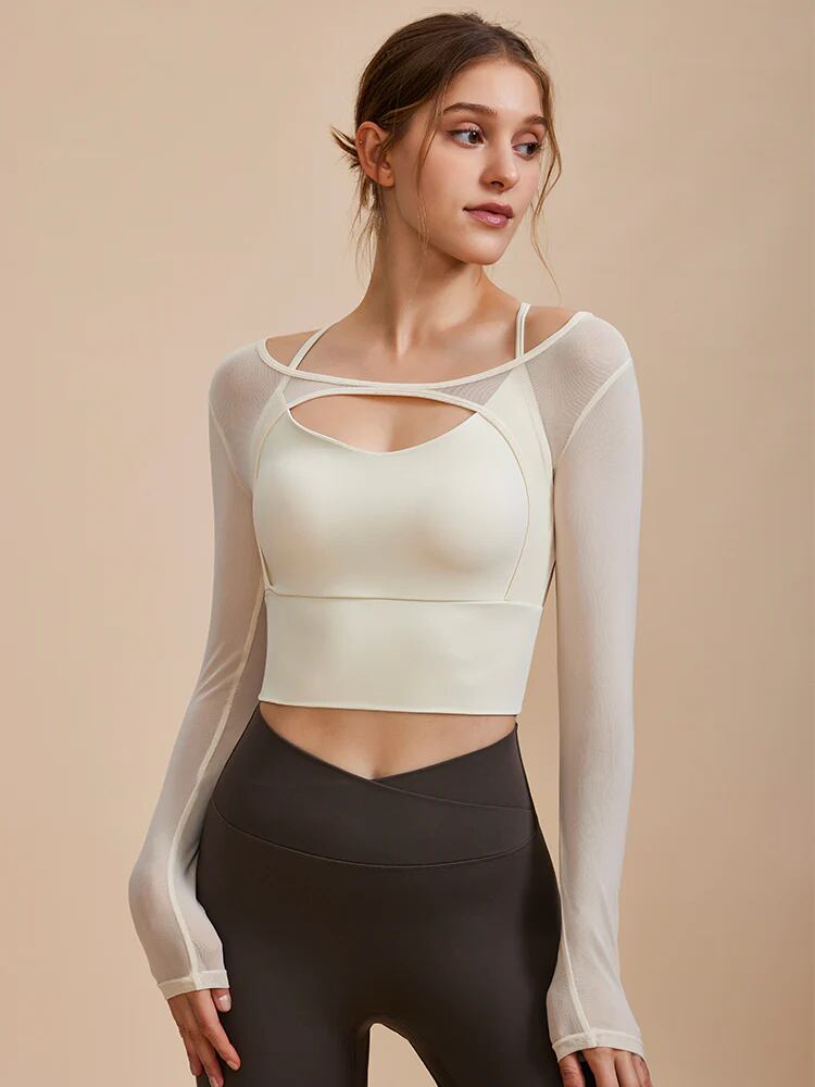 ホルターネック メッシュ切り替え ブラトップ長袖 フェイクレイヤード