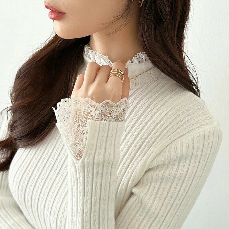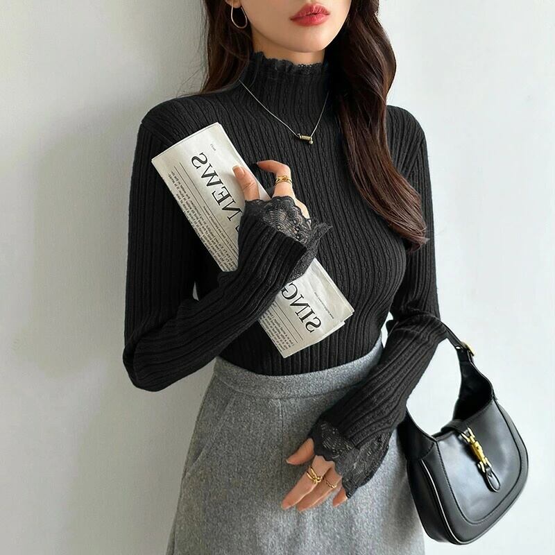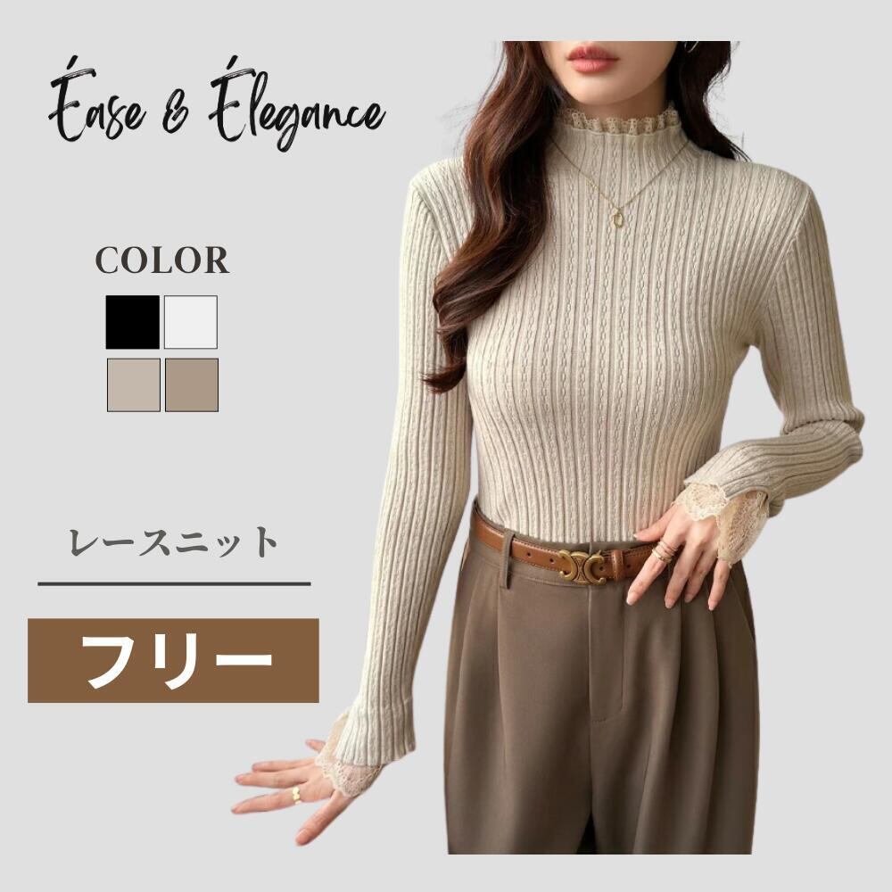 ニット 袖レース ハイネック レディース トップス リブ ハイネック ニット 長袖 重ね着 ニットリブニット フリルネック フィット ドッキング ニットセーター 袖長め 柔らかい リブ 可愛い タイト 薄手 フィット感 レース フレア袖 レースニット 秋冬 春 秋 冬 人気 おすすめ