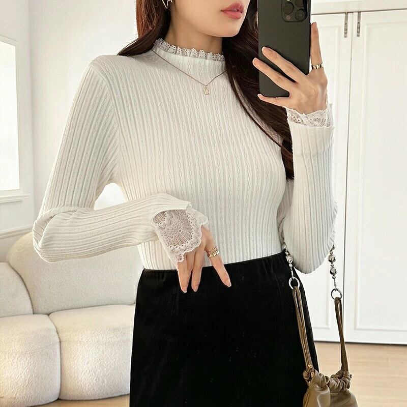 ニット 袖レース ハイネック レディース トップスは、シンプルながらもエレガントな印象を与えるアイテムです。柔らかいリブ編みの素材は肌に優しく、着心地も抜群。ハイネックデザインが首元をすっきりと見せ、フリルネックが可愛らしさをプラスしています。また、袖部分にはレースを施し、さりげないおしゃれ感を演出。タイトなシルエットは身体のラインを美しく引き立てながら、長袖仕様なので重ね着にも最適です。秋冬だけでなく、春にも活躍する万能トップスです。
