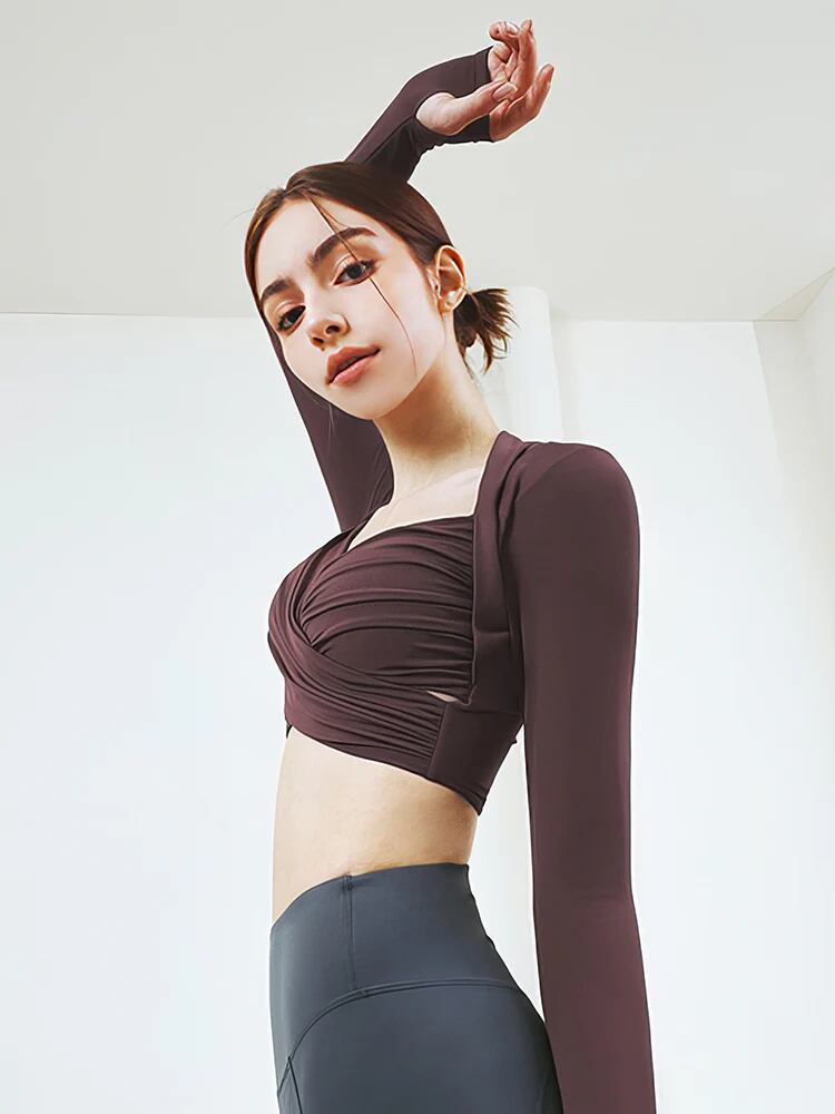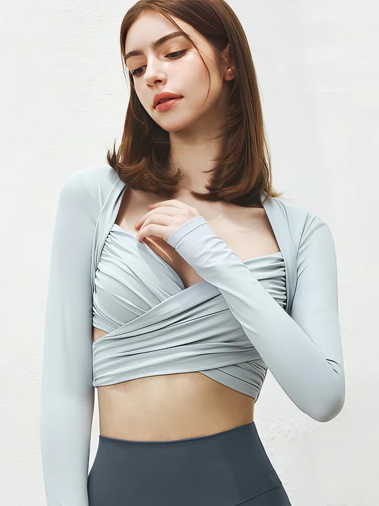 胸元が開いたV字型のクロスデザインは、通気性が良く、ヨガやフィットネスのトレーニングに適しています。また、上品でエレガントな印象を与え、普段着としても活用できる万能なアイテムです。