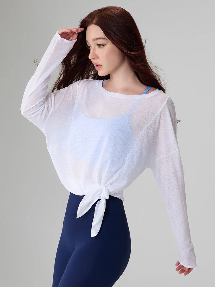 ヒップまわりが隠れる丈感で、裾はそのままたらしても結んでもおしゃれ。