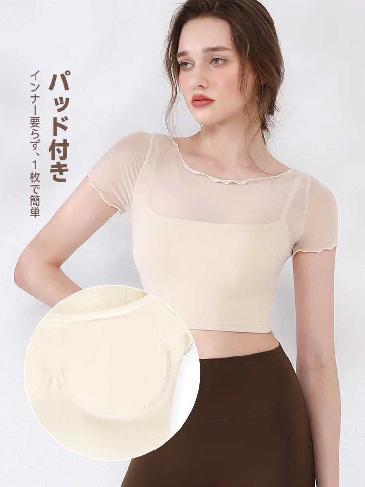 メッシュ切り替え フェイクレイヤード 半袖 パッド入り