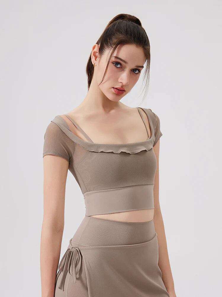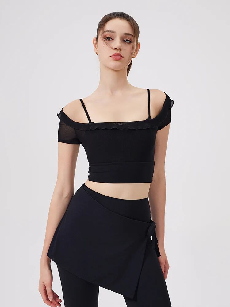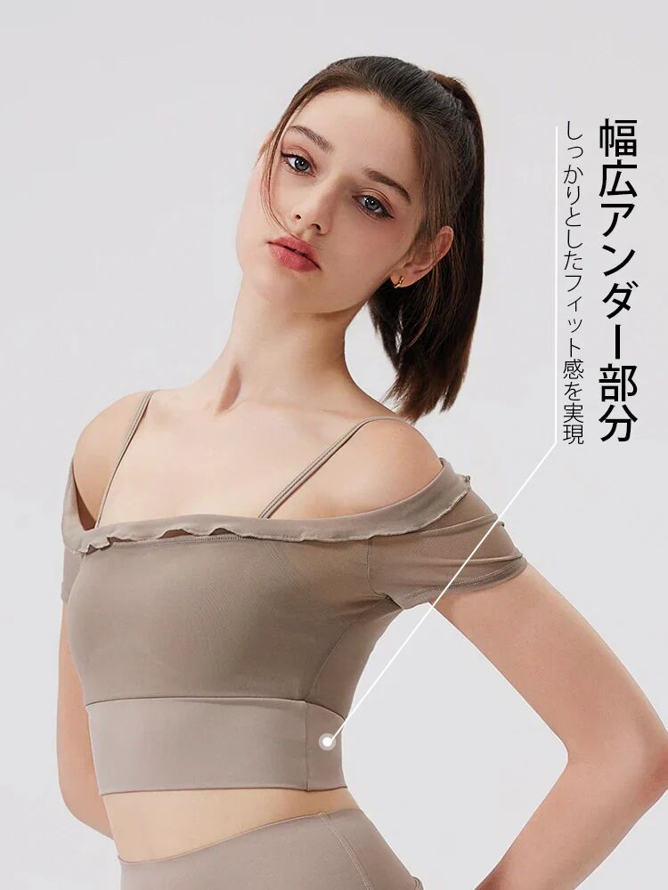 フェイクレイヤード メッシュ切り替え 半袖 パッド付き オフショルダー
