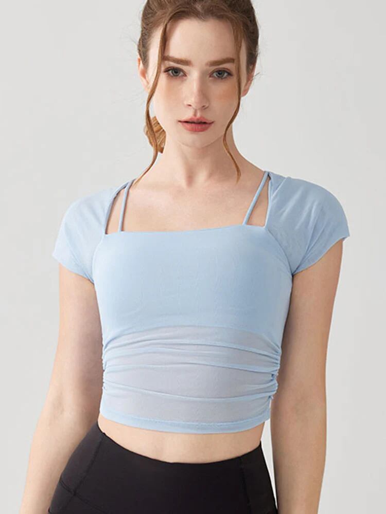 バレエのレオタードのような透け感が女性らしい、ブラカップが内蔵されたトップスです。
