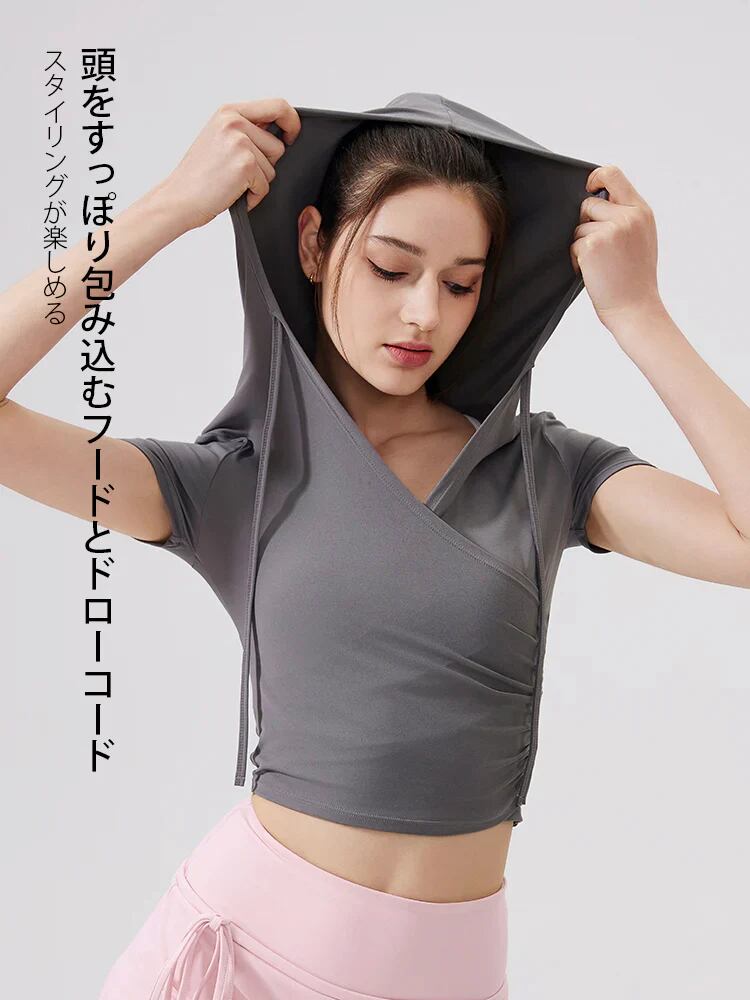 接触冷感素材を使用し、肌に触れた瞬間ひんやり快適。フードはドローストリング付きで、気分やスタイルに合わせて調整可能です。